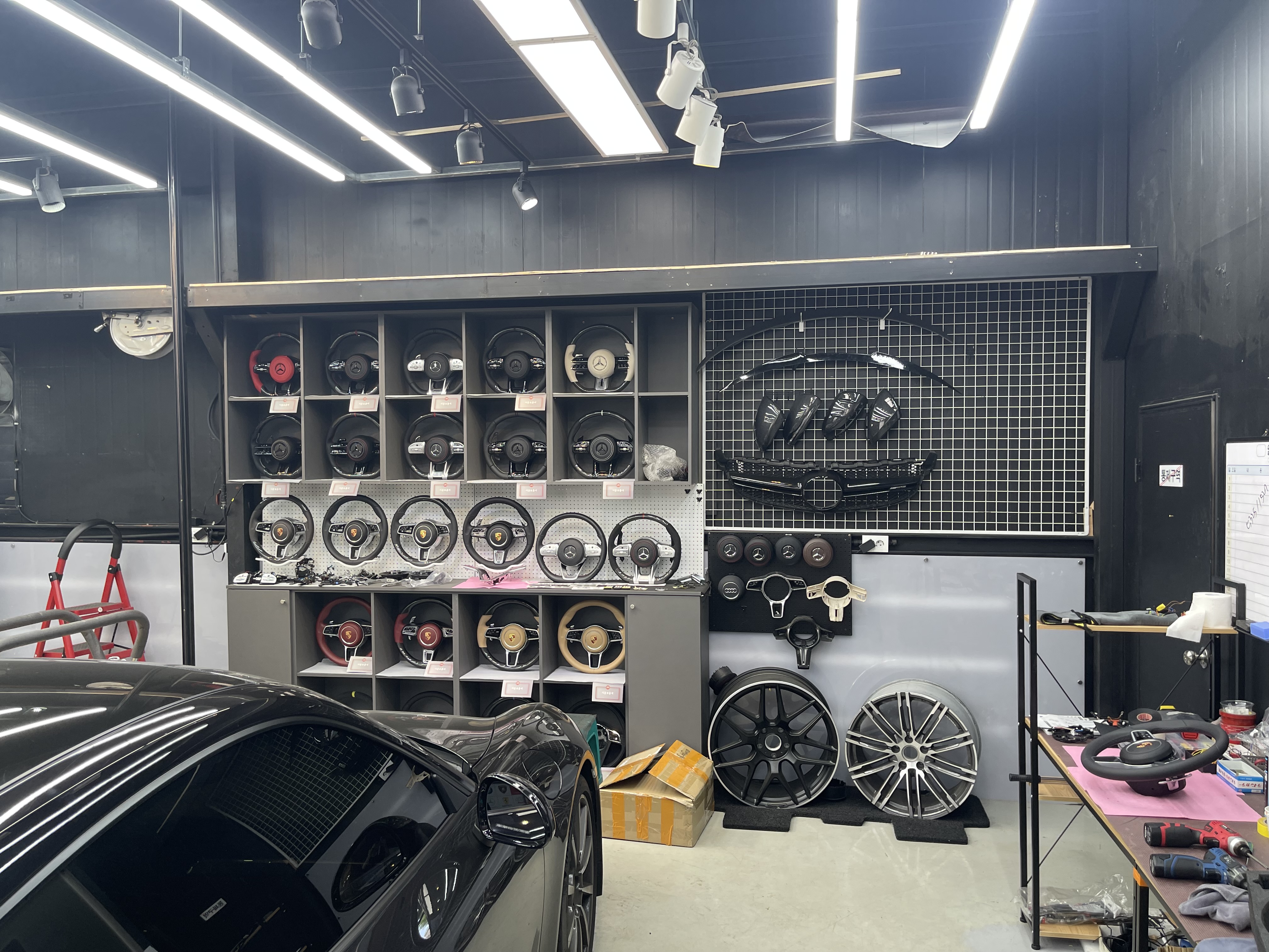 샵에 들어서니 커스텀 스티어링 휠도 상당히 많았다. 카본으로 떡칠된 핸들도 있고 D컷 핸들도 있고.. 하지만 안전을 위해 정품 핸들로 교환하기로 했다.