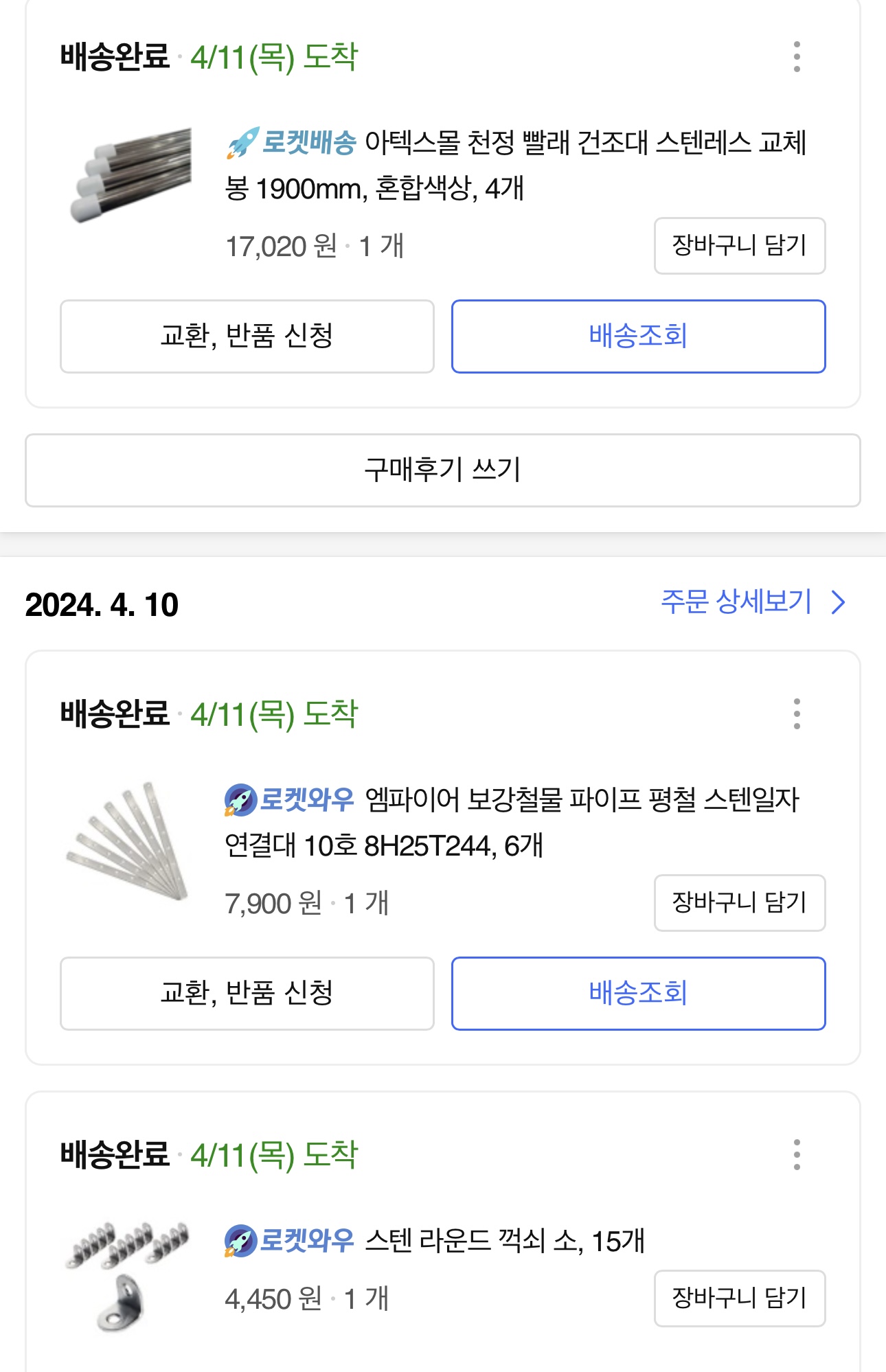 그래서 2미터에 가까운 빨래 건조대 교체봉(스테인리스임;)과 평철 스테인레스 연결브라켓과 ㄱ자 꺽쇠를 각각 주문했다. 봉은 1개 낱개로도 살 수 있었지만, 이미 마음 먹은 상태라 빨리 해보고 싶어서 로켓배송이 가능한 4개 짜리로 구매했다.