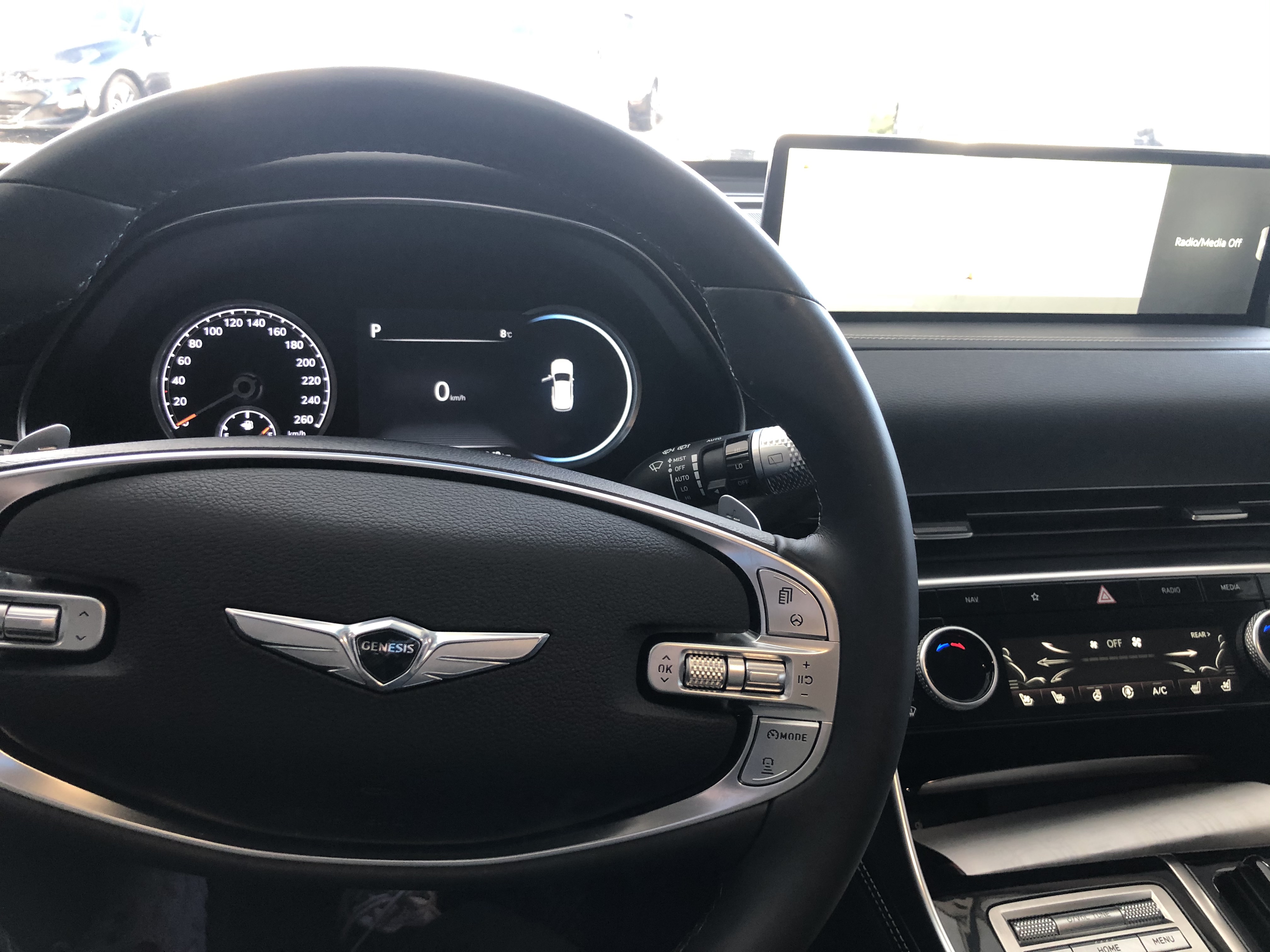 차키를 받았는데, 키 자체는 엄청 고급지다는 느낌은 없지만 심플해서 만족스러웠다. 실내로 들어왔을 때 가장 눈에 띈 건 럭비공같이 생긴 스티어링 휠과 길게 늘어진 디스플레이였다. 개인적으로 럭비공 모양의 스티어링휠은 내 취향이 아니어서 항상 별로라고 생각했는데, 양 손으로 움켜쥐었을 때 촉감이 매우 폭신폭신하고 조향감이 괜찮았던 기억이 난다. 디스플레이는 굉장히 길어서 텍스트가 선명해 보인다는 장점이 있고, 웰컴, 클로징시에 제네시스 시그니처 음악이 나오면서 디스플레이가 온/오프 되는 부분은 고급감을 더해줬다.