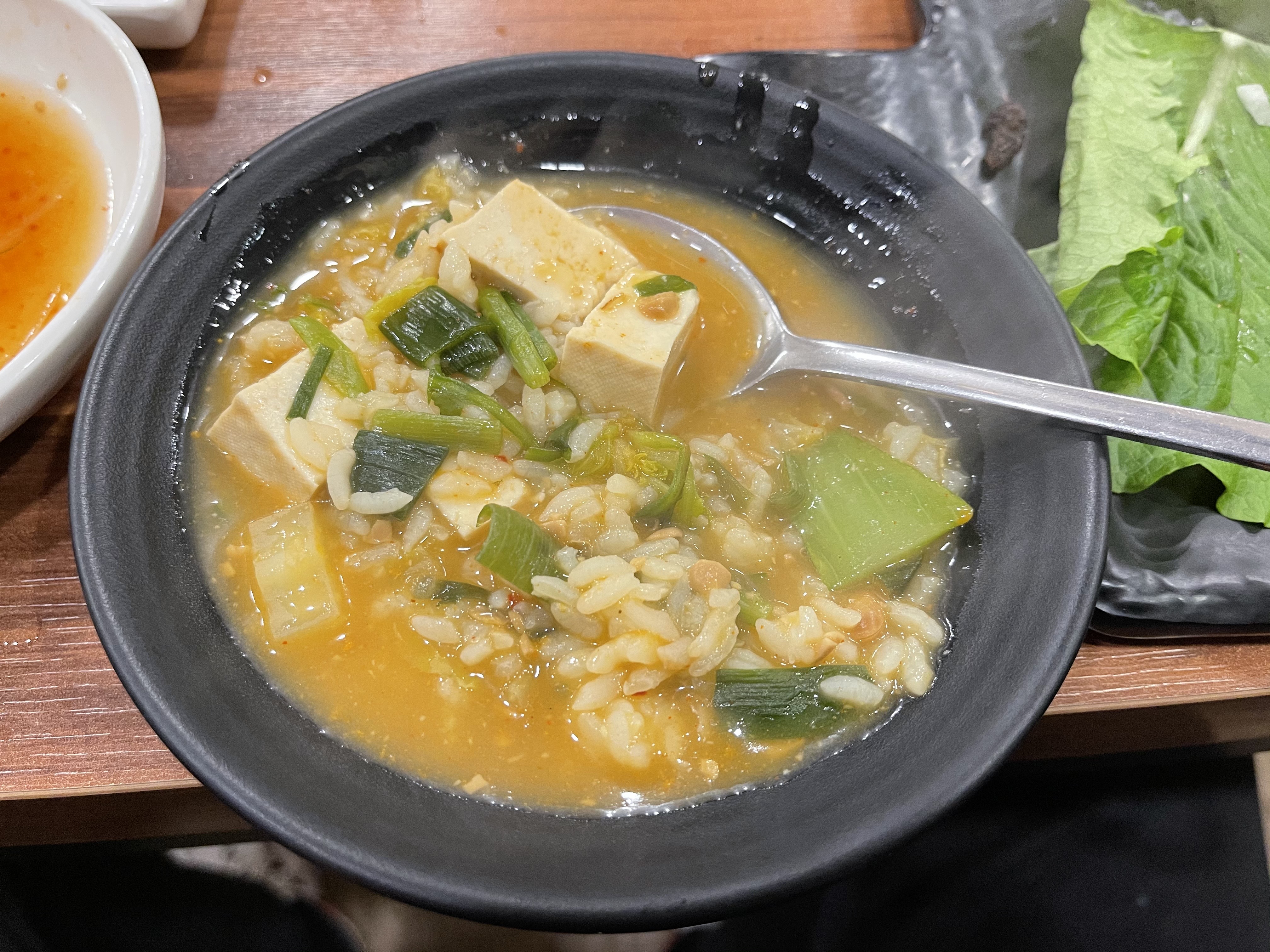 위장에 빈 곳이 없게 기름칠을 마쳤으니, 이제는 좀 개운하게 마무리를 해야겠다 싶어 된장 술국을 주문했다. 가격은 5000원인데, 둘이서 먹는 양으로 부족함이 없었다. 된장 술국은 깊은 맛이 있는 편은 아니고, 간을 잘 맞춘 '짭쪼름 한' 맛이다. 그렇다고 그냥 짠 맛이 아니라, '감질나게 맛 있는' 그런 맛 이었다.