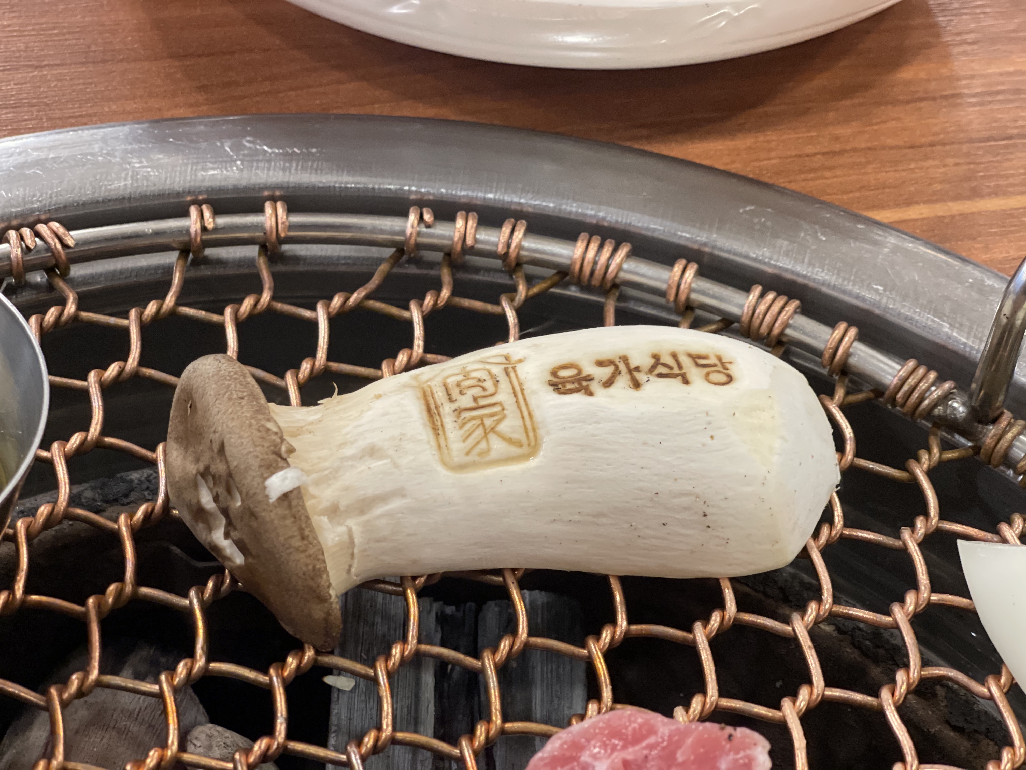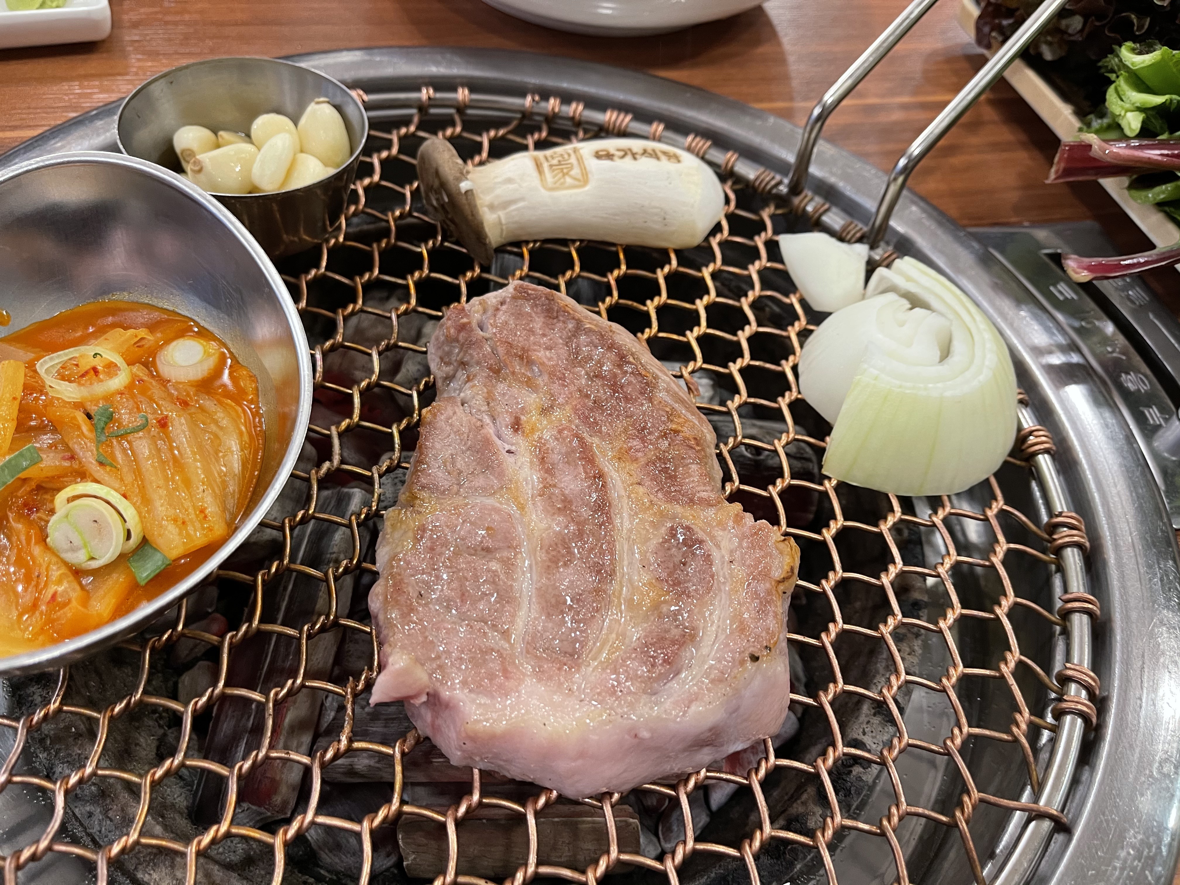 드디어 불을 올리고 고기가 나왔다. 고기는 약 700g으로, 살짝 육회로 워밍업을 한 위장에 고기를 야채로 싸서 강하게 밀어 넣었다. 모듬 고기에는 삼겹살, 목살, 오겹살, 갈매기살이 있는 것 같다. 이 중에서 보들보들한 목살이 일품이었다. 직화로 구워 먹으니, 대학 시절 포항에서 먹던 주먹고기가 생각이 났다. 쌈은 위 사진에 가져온 것을 다 먹고 같은 양을 그대로 가져와 또 먹었다. (다이어트는 내일..)