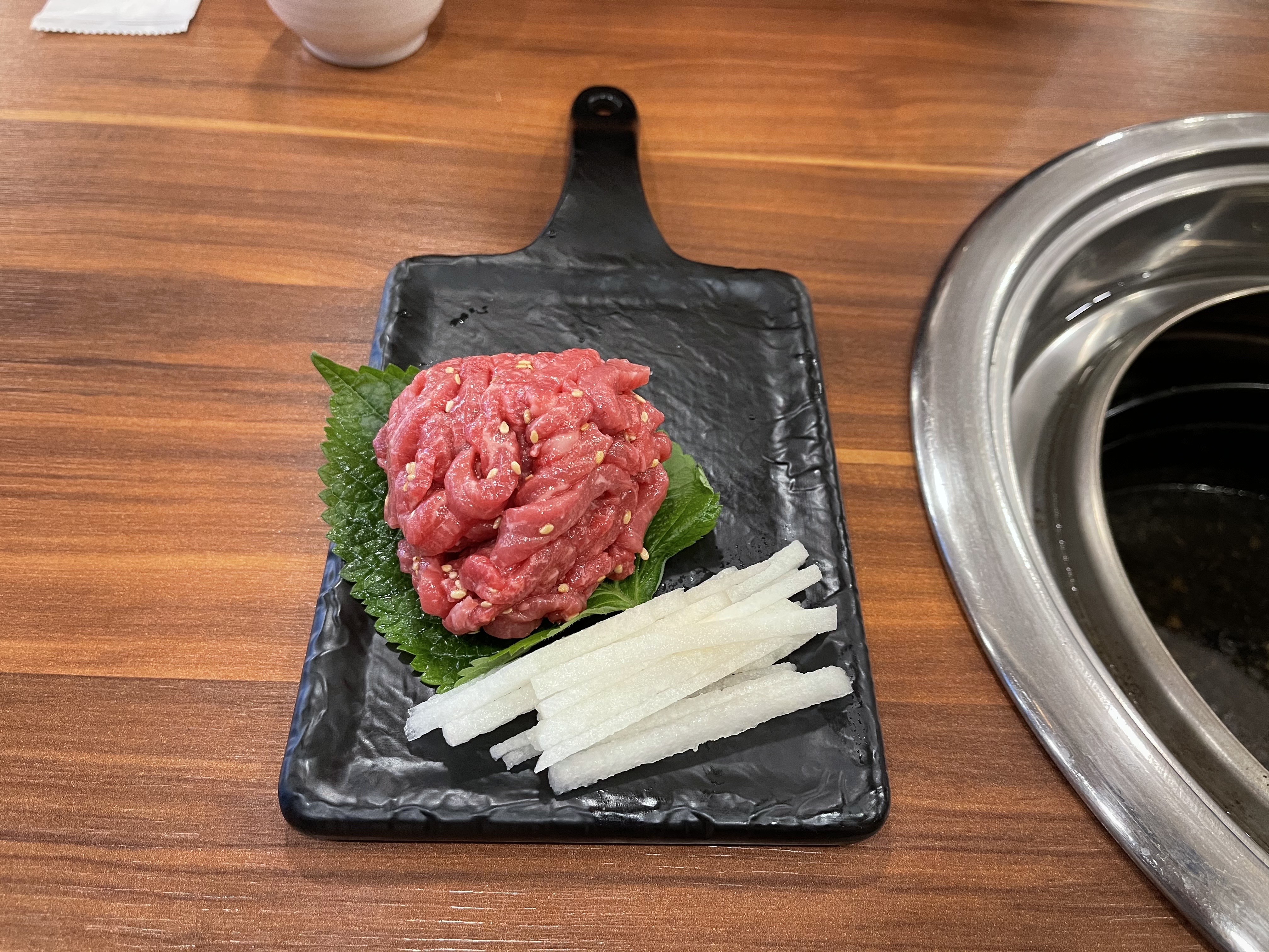 메뉴판을 봤을 때, 돼지고기 기준 보통 삼겹살 가게보다 살짝 비싸거나 비슷한 정도여서 큰 부담 없이 주문을 할 수 있었다. 오늘은 좀 배불리 먹어보자 하고 일품 한우 육회와 육가 모듬 돈 (도합 820g)을 주문했다. (둘이서..?)