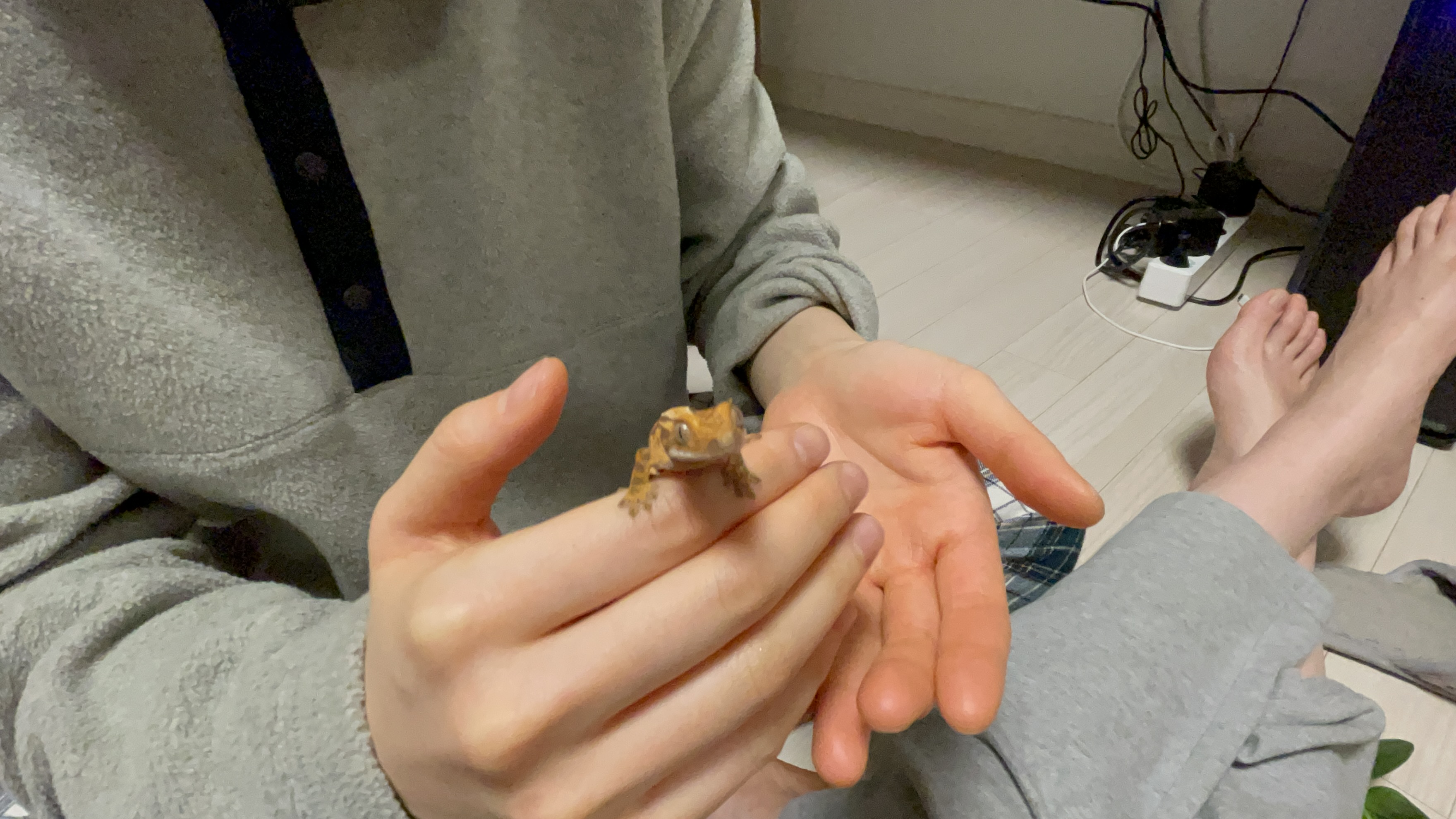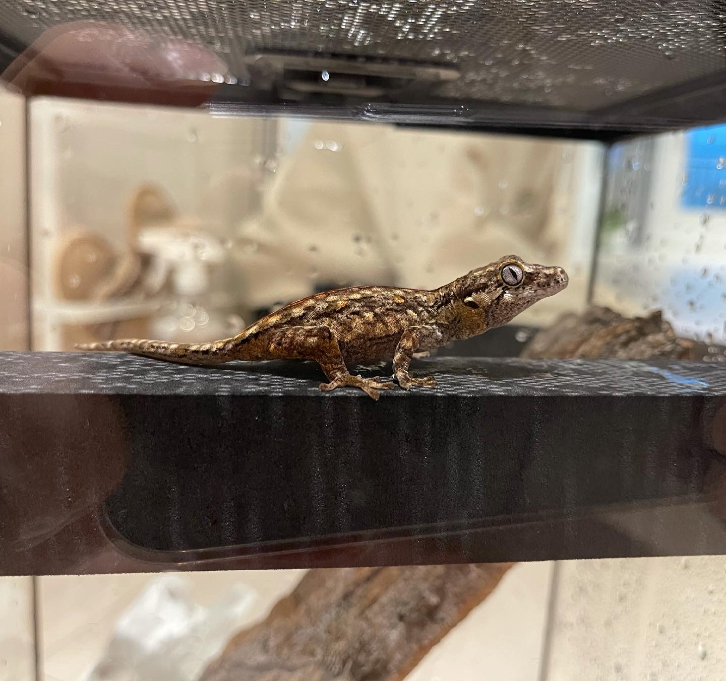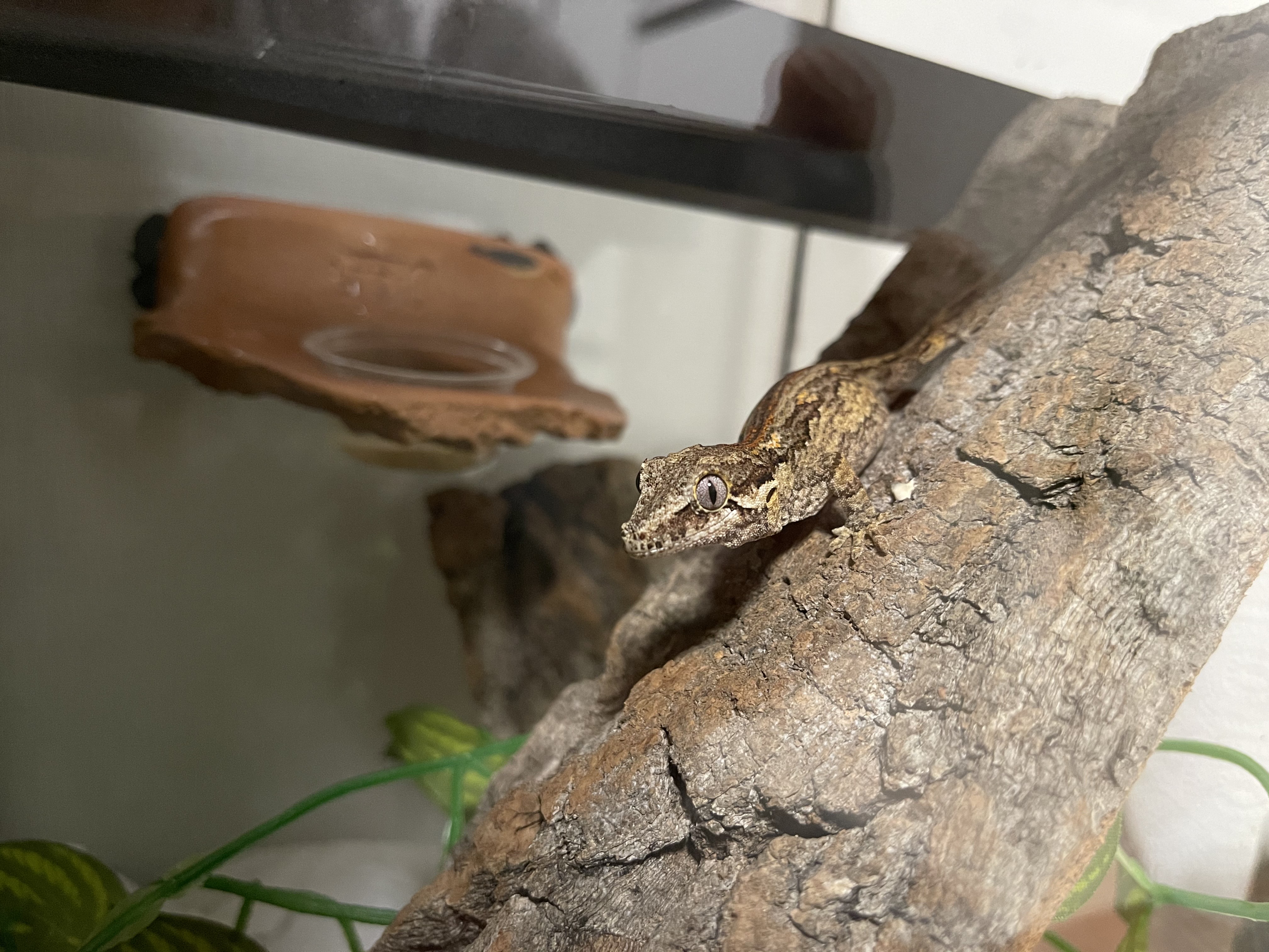 말이가 사는 유리 사육장과 동일한 모델을 구매했고, 거의 비슷한 환경을 조성해 줬는데 오늘 마음에 드는 유목을 구하지 못해서 다음 번에 구매할 예정이다. 크레스티드 게코보다 가고일 게코가 조금 더 예민하다던데, 확실히 만지려고 할 때마다 점프를 너무 많이 해서 오히려 내가 깜짝 깜짝 놀랐다. 무게는 6g. 현재 두 달 정도 기른 크레가 아직도 4~6g 사이를 왔다 갔다 하는데 .. 데려오자마자 6g이라니, 어쩐지 배를 보니까 벌써부터 똥똥한 느낌이다.