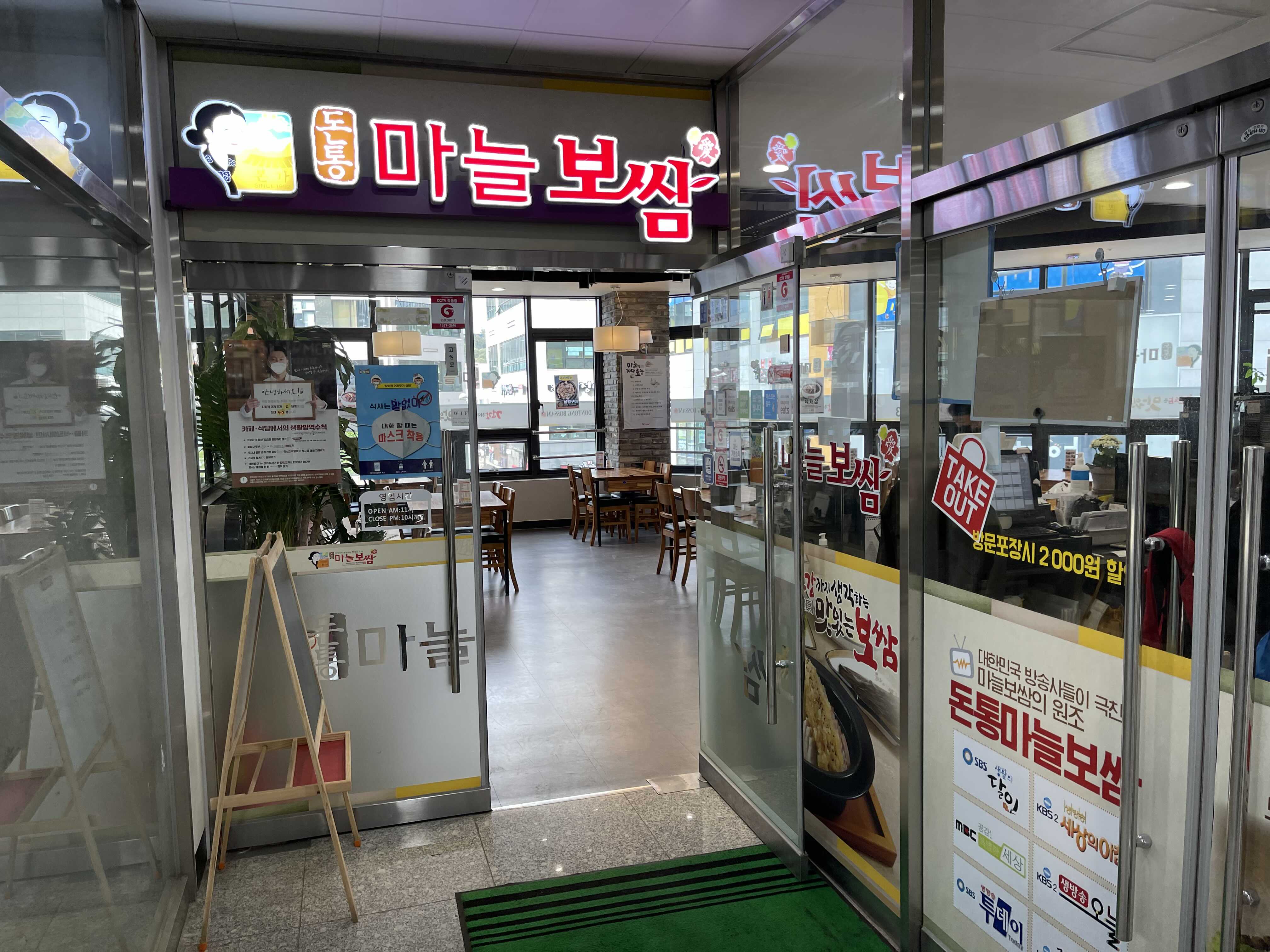 아내랑 마산동에 디테일링 세차를 맡긴 후 시간이 남아서 빠른 저녁식사를 할 거리를 찾으며 걷다가, 상가 단지에 마늘 보쌈 집이 있는 것을 발견했다. 마늘이라면 껌뻑 넘어가는 나였기에, 간판을 보자마자 돈통 마늘보쌈으로 향했다.