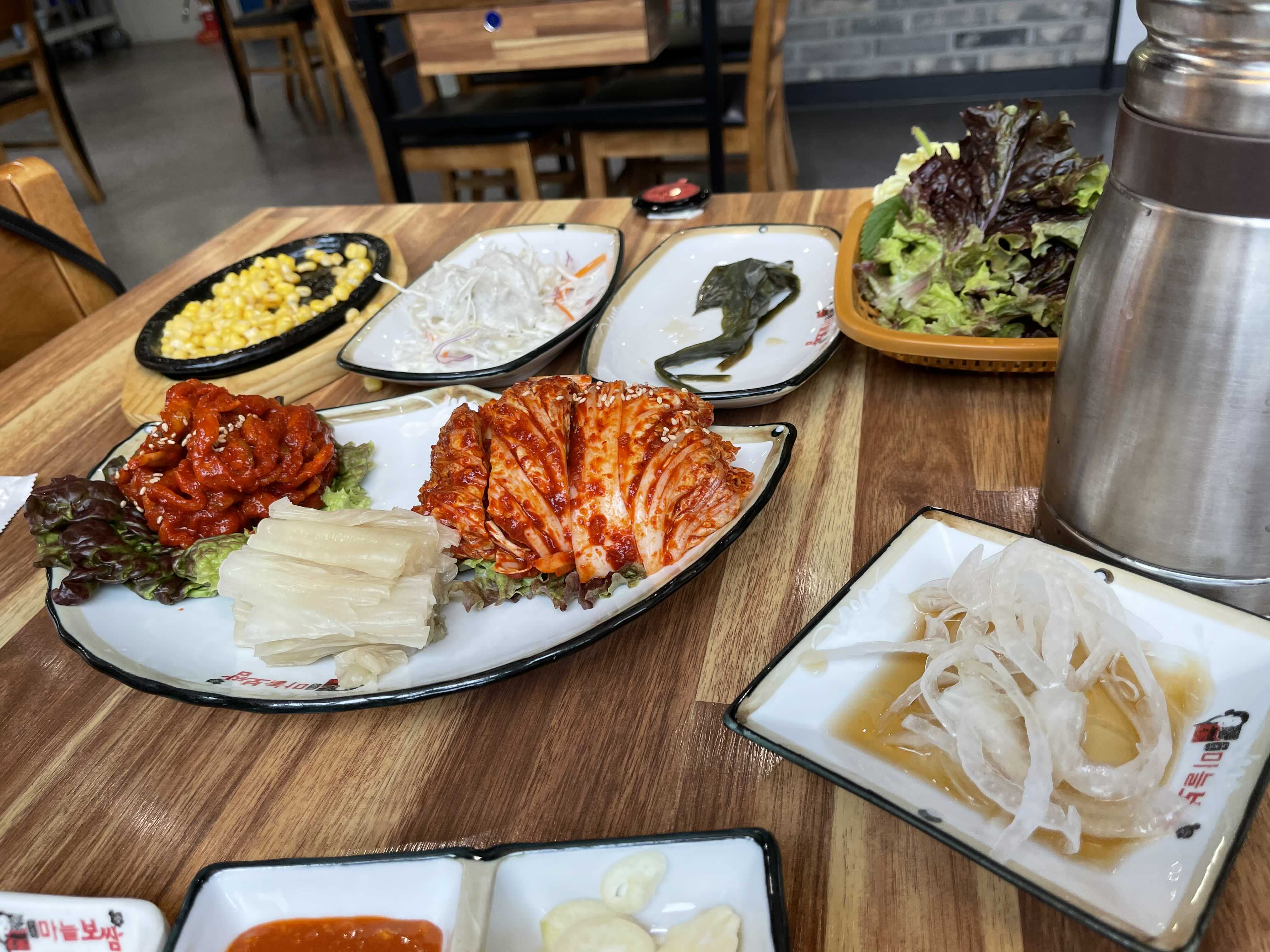 마늘 색깔이 황금색인데, 굉장히 달아서 보쌈을 먹을 때 심심할 틈이 없다. 양파, 김치, 백김치 등 곁들여 먹을 수 있는 채소들도 많아서 많이 먹어도 뭔가 죄책감이 들지 않는 느낌이 들었다.
