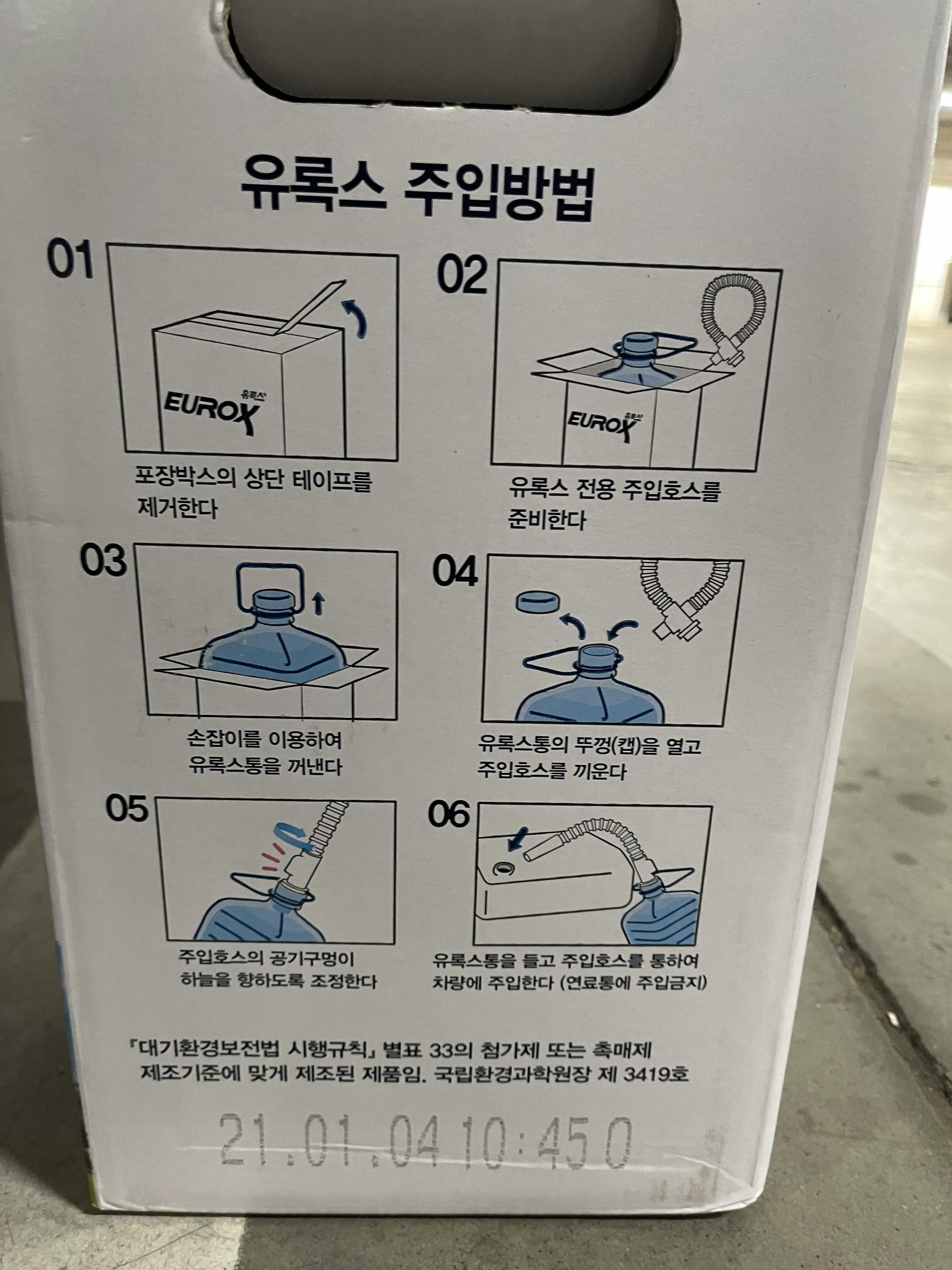 박스를 까면 호스같은 게 있는데 요소수 뚜껑을 열고, 호스를 꽂아서 차량의 요소수 주입구에 콸콸 쏟으면 그만이다. 요소수 용량은 차 마다 다르지만, 내 차의 경우에는 부족한 요소수 양을 알려주기 때문에 10L를 전부 넣으면 됐었다.