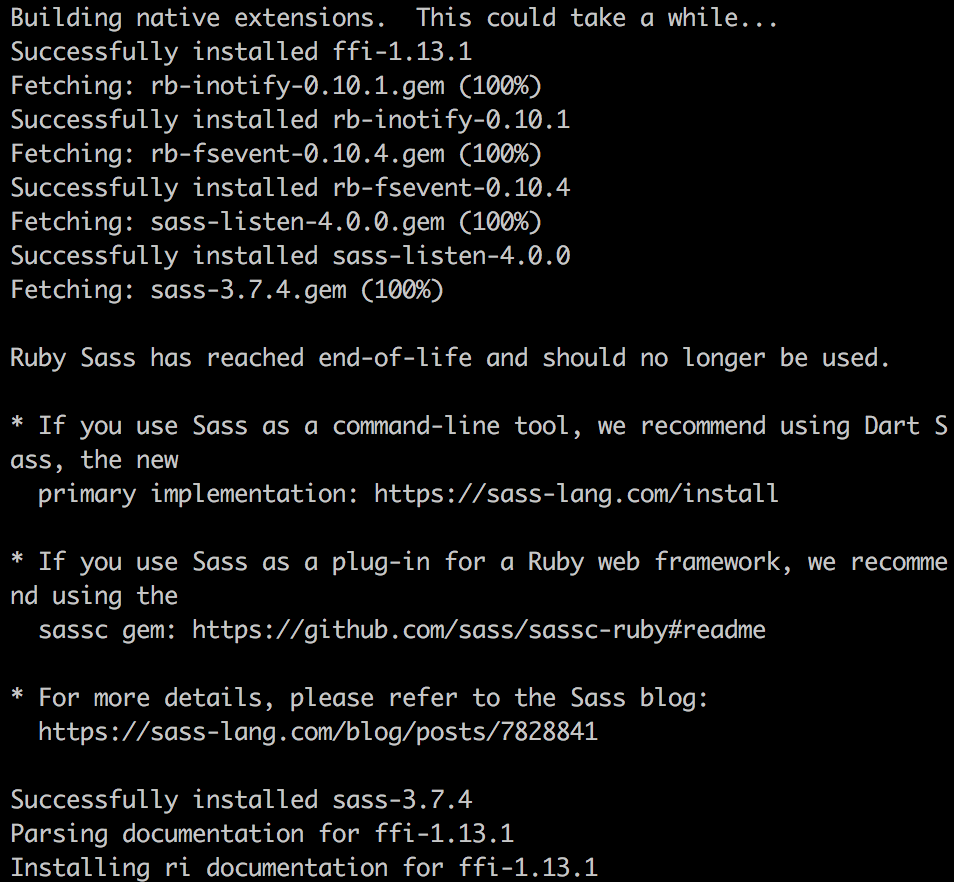 그 다음 다시 gem install sass 을 실행해 보면 아래와 같이 인스톨에 성공하는 메시지를 보게 된다.