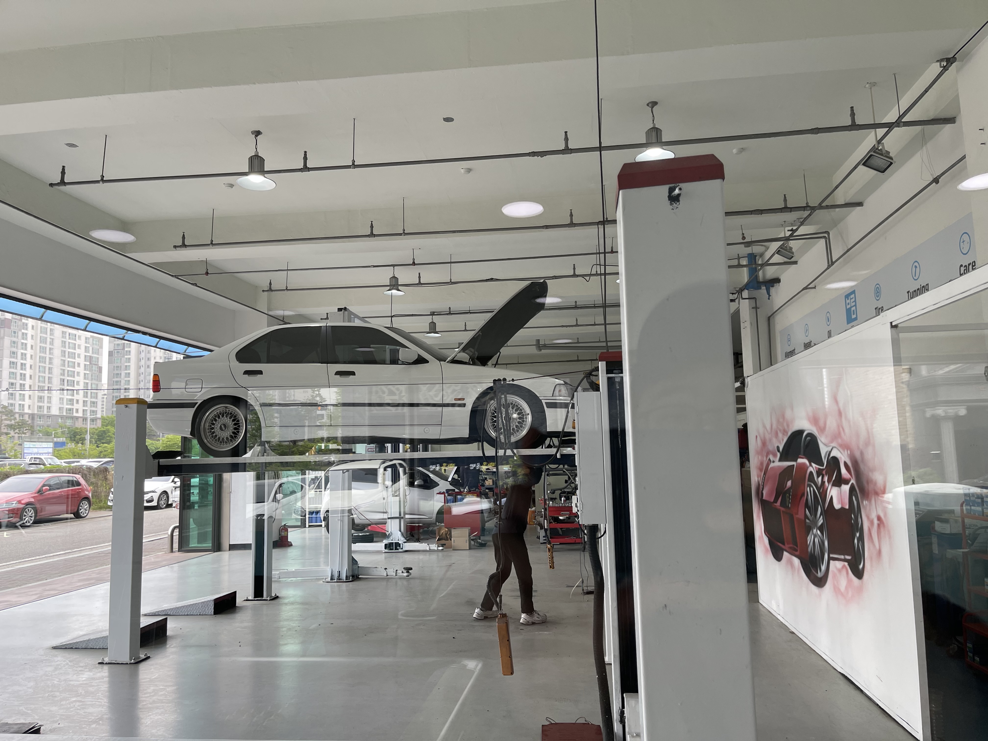 정비 기사님께서 외근 나가 계신 동안 너무 일찍 와서 대기실에서 기다리고 있다. 응? 근데, 차량을 리프트로 올려 보니 트렁크 쪽 하부에 구멍이 두 개가 뚫려있다. 아... 차체를 너무 낮춰서 구멍이 생긴 건가.. 이 구멍 때문에 트렁크 내부가 보인다. 물론 지금은 스페어 타이어가 구멍을 가리고 있지만, 부식이 더 심해지면 구멍이 아니라 전체적으로 암 처럼 찢어질 것이다. 이 부분도 체크. 엊그제 미러커버를 신품으로 주문해서 이게 도착하면 나중에 도장 작업을 할 건데, 그 때 여기도 함께 처리해달라고 해야겠다.