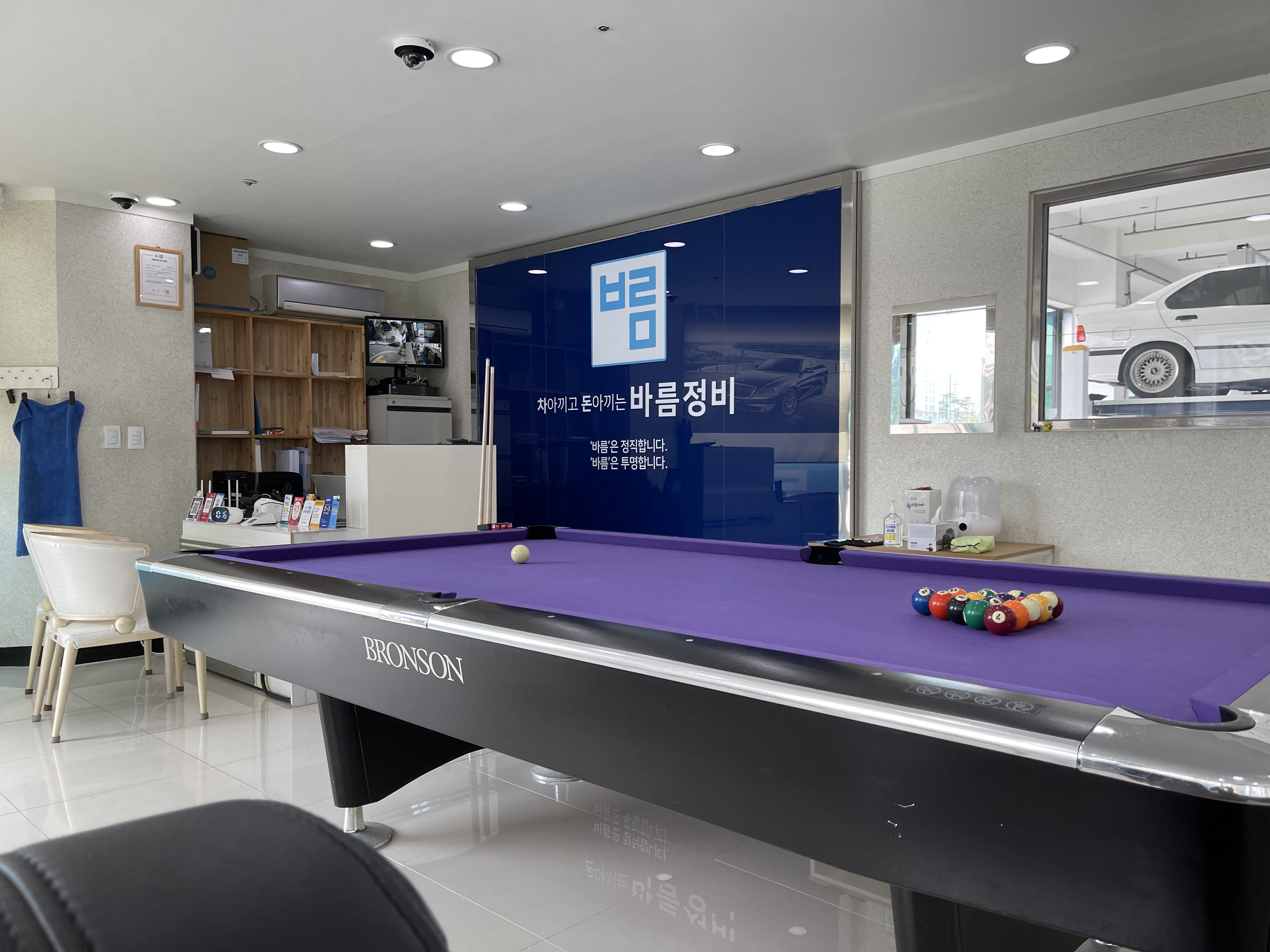 바름정비 고객 대기실에는 당구대도 있고, 자유롭게 TV를 시청할 수도 있다. 또 창문 밖으로 내 차량이 잘 점검되고 있는지 확인도 가능하다.