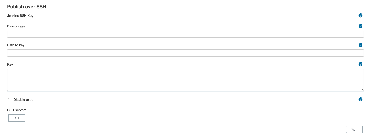 - Jenkins 관리 -> 시스템 설정 -> Publish over SSH 항목에 배포서버의 ssh private key를 저장