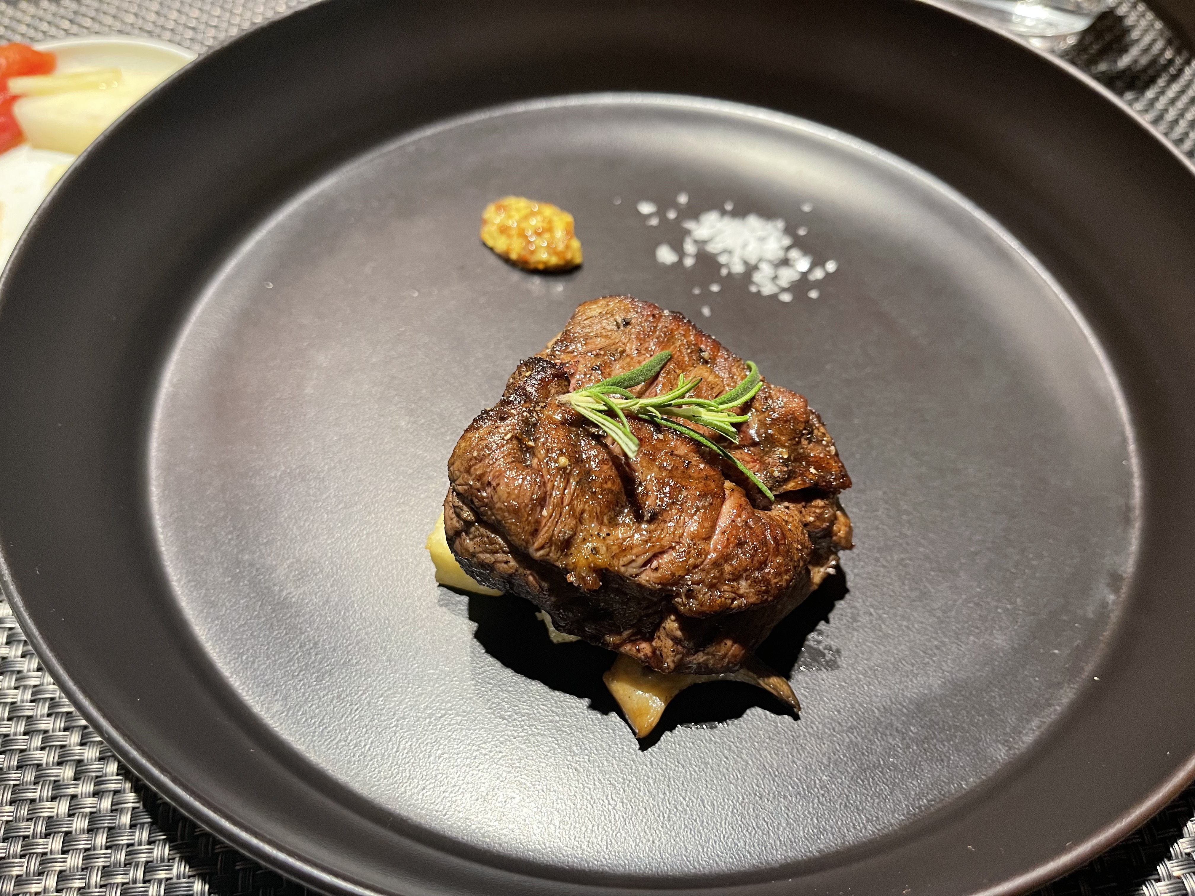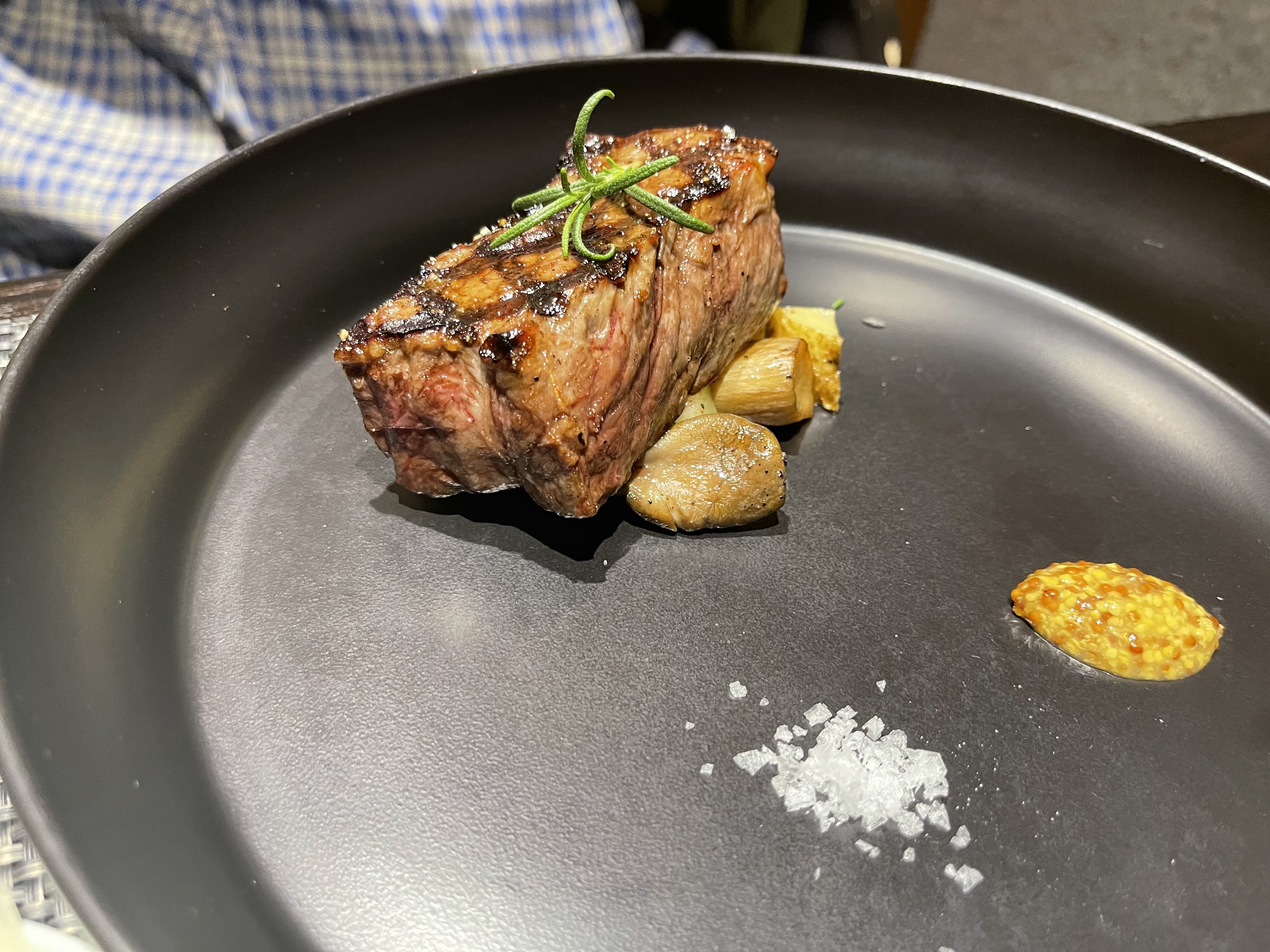 한우 암소 아랫등심 그릴구이.. 2만원 추가메뉴인데, 확실히 부채살보다 식감도 좋고 맛있었다. 내가 원래 스테이크 핏기 있는 미디움급을 잘 못먹는데, 여기는 굽기를 따로 물어보지 않길래 어떡하지 했지만 피맛도 거의 나지 않고 입맛에 잘 맞았다. 스테이크가 원래는 사람마다 입을 타기 때문에 어디서는 맛집이라 해도 사람에 따라 최악인 곳도 있고 그런데, 일단은 미디움 웰을 좋아하는 나한테도 잘 맞았음. 오른쪽이 부채살 스테이크. 맛있긴 하지만 그래도 코스메뉴가 65,000원밖에 하지 않으니 웬만하면 추가금 있는 걸 먹는 게 좋지 않았을까 싶다.