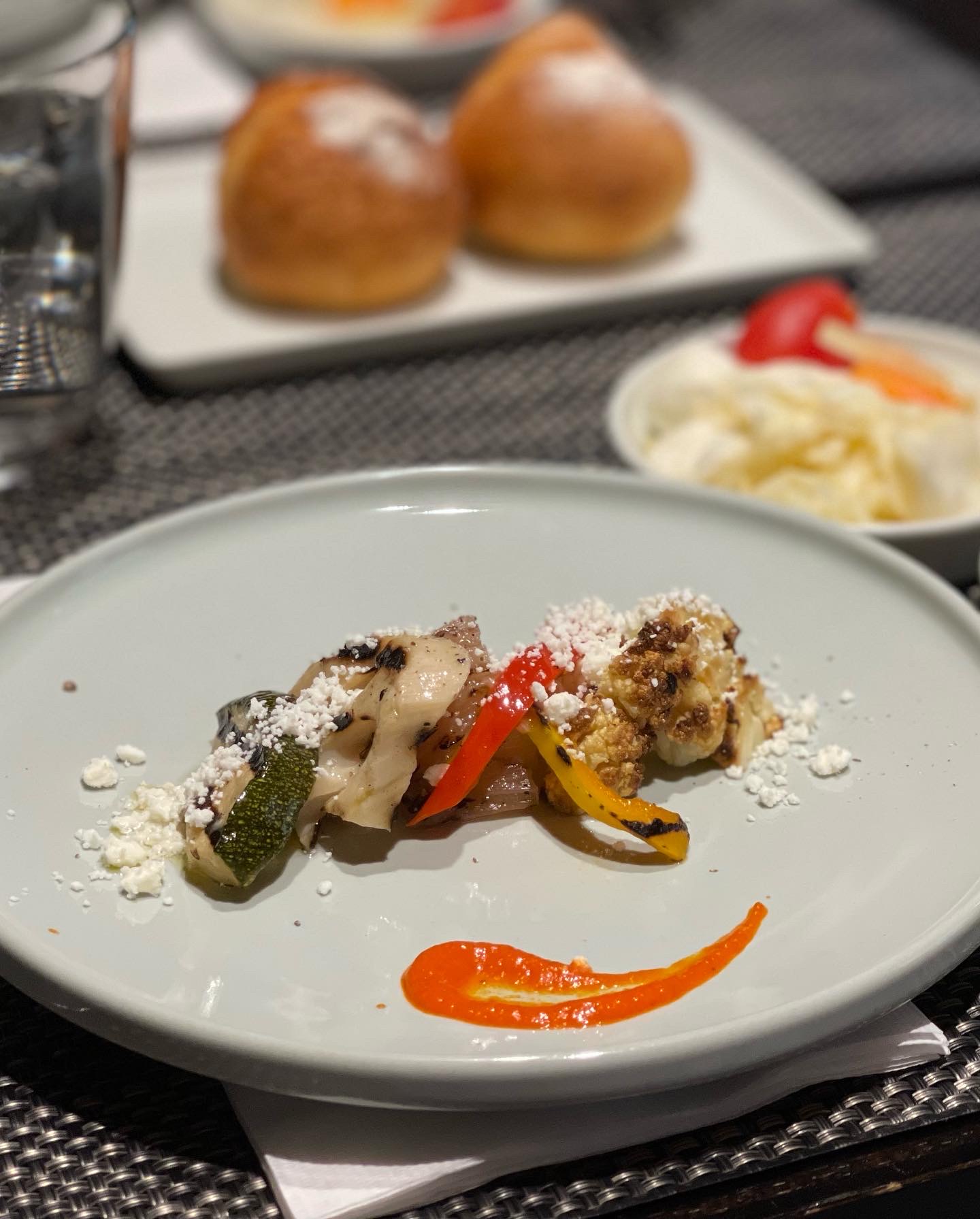 가장 먼저 나온 메뉴는 그릴드 야채. 대체로 적당히 잘 구워져 있는 야채들인데, 브로콜리 싫어하는 나도 맛있게 먹을 수 있었다. 올리브유가 살살 묻어 있는 것이 풍미가 아주 좋았다. 빵도 나오는데 겉은 되게 단단하지만 속이 아주 부드러워서 야채와 곁들여 먹기가 좋았다.