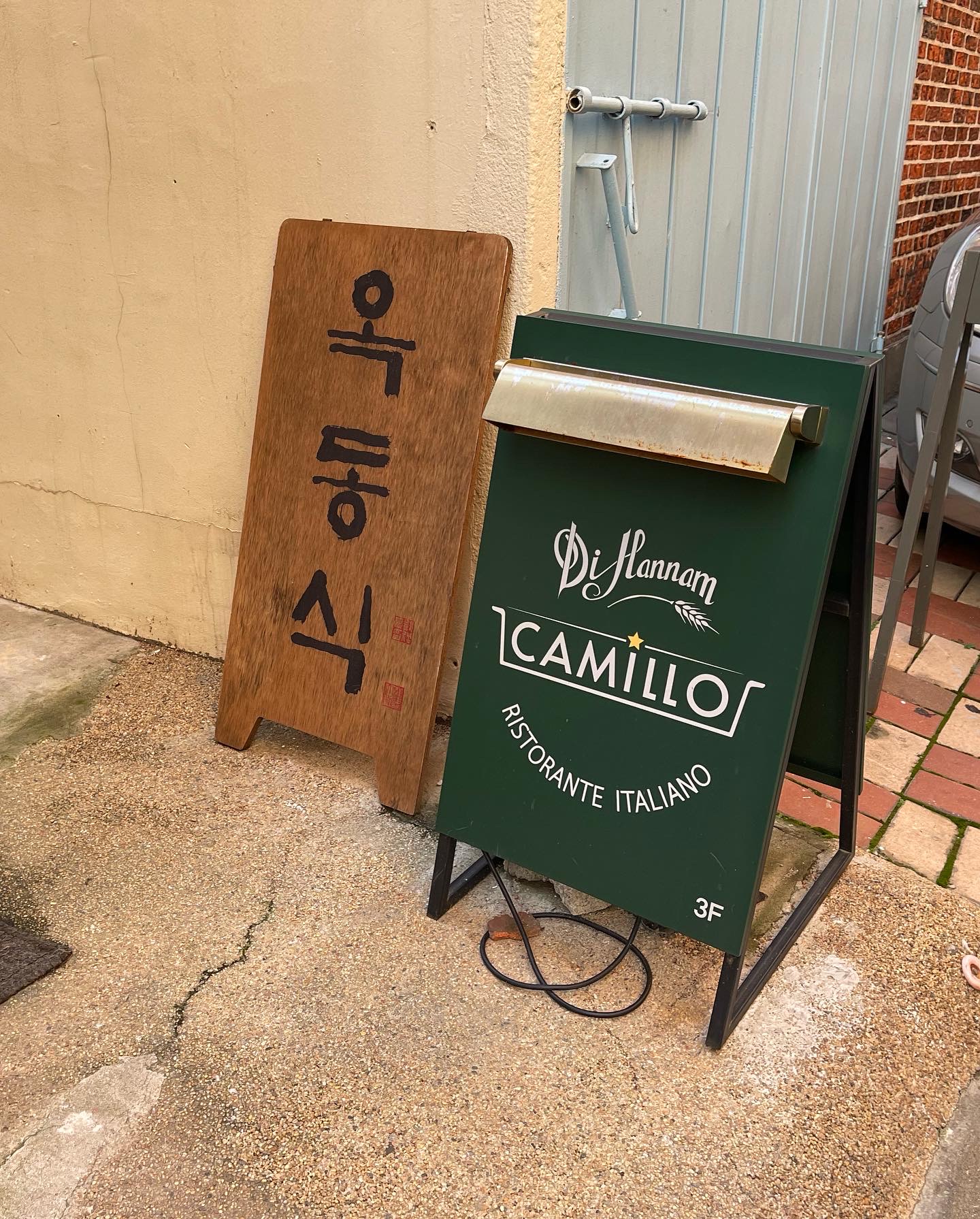 까밀로 한남은 언덕길(대로변)에서 조금 들어오면 있는 막다른 골목 쪽에 위치해있으며, 1층에는 옥동식이라는 가게가 있다. 실수로 옥동식문을 열었었는데 여기가 아니라 3층까지 올라가면 입구가 있다. (2층은 치과) 되게 신기한 게 문을 열면 바로 주방이라 여기가 정문인가 싶은데 정문 맞다. 문 열고 오른쪽으로 들어가면 테이블들이 있으며 잘 자리는 정돈되어 있었다.