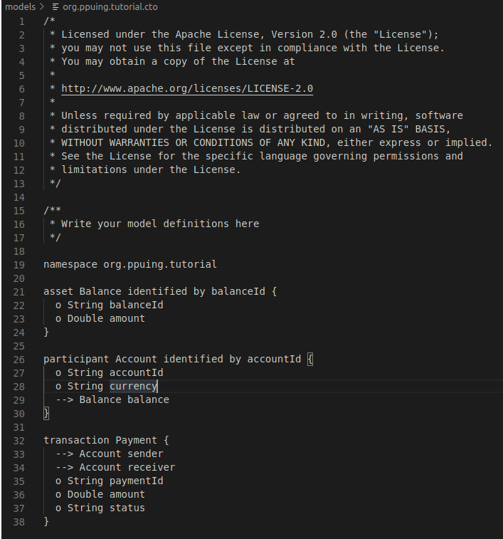 그런 다음 text editor를 열어서 models.cto, logic.js, queries.qry 파일을 아래 그림처럼 수정한다.