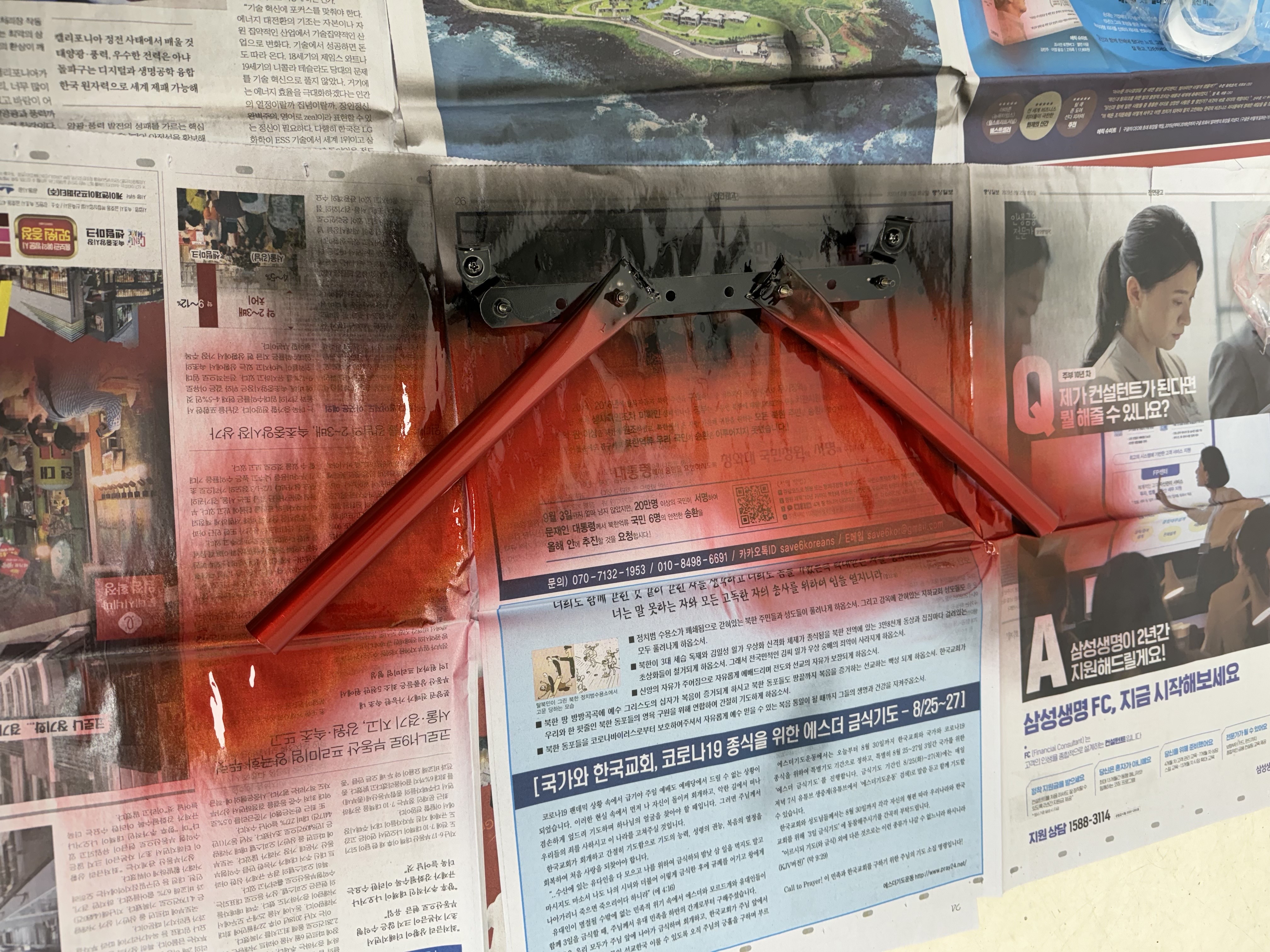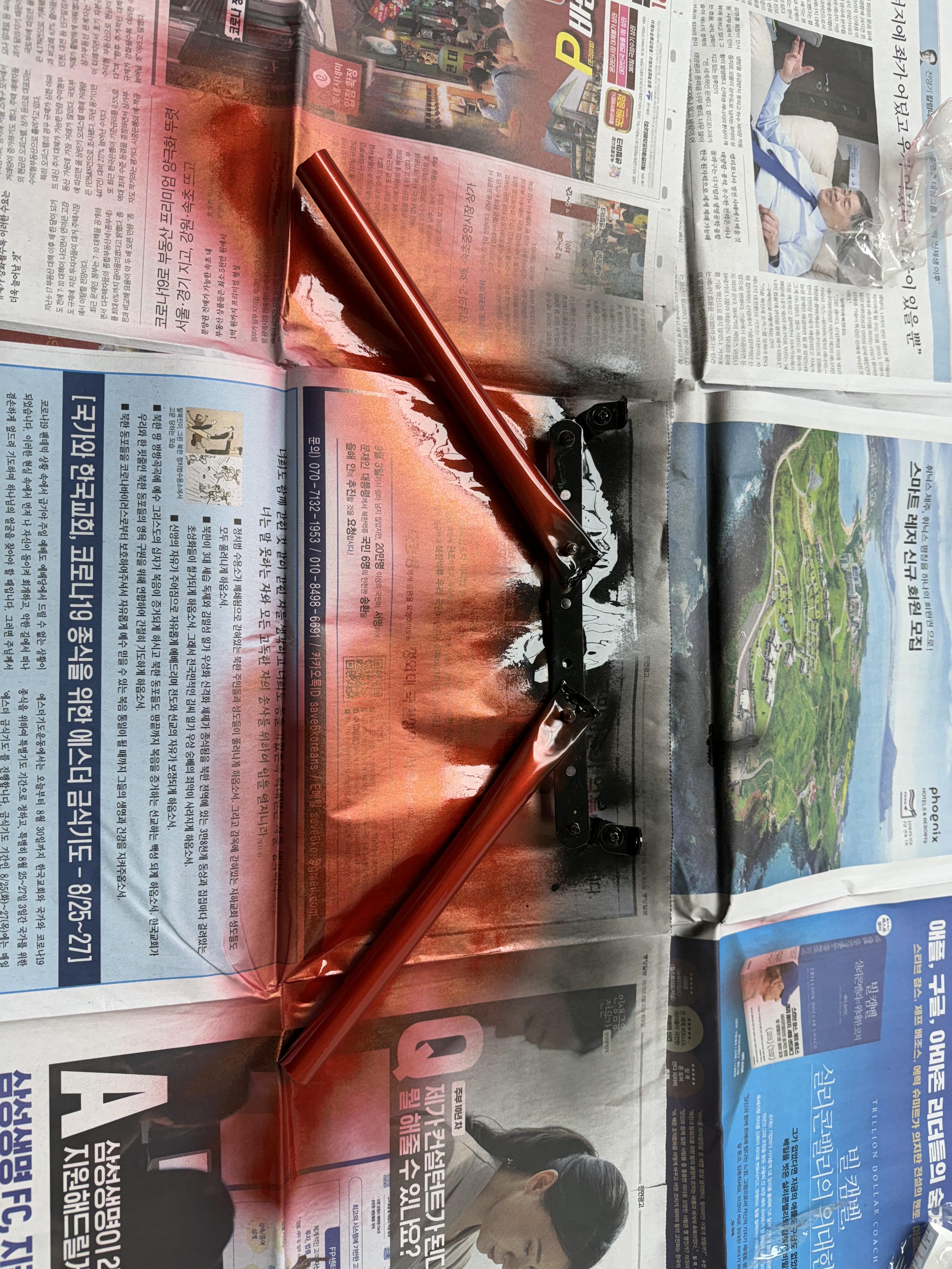 이번엔 도색을 한다. 도색의 경우 좀 쨍한 색을 선택해야 할 거 같다. 내가 선택한 컬러는 프라이드의 레드 컬러인데, 이게 약간 주황빛이 나면서 어두운 붉은 색이다. 차량 안에 이 스트럿바를 넣을 거기 때문에 그림자가 지면 너무 어두워서 잘 안 보인다. 그래서 쨍한 빨강으로 선택해야 그나마 그림자가 지면 은은하게 보일 수 있을 것 같다. 아무튼 상단의 ㅣ자 브라켓은 검게 도색하여 안 보이게 하고, 봉만 붉은 색으로 도색했다. 결과는..!