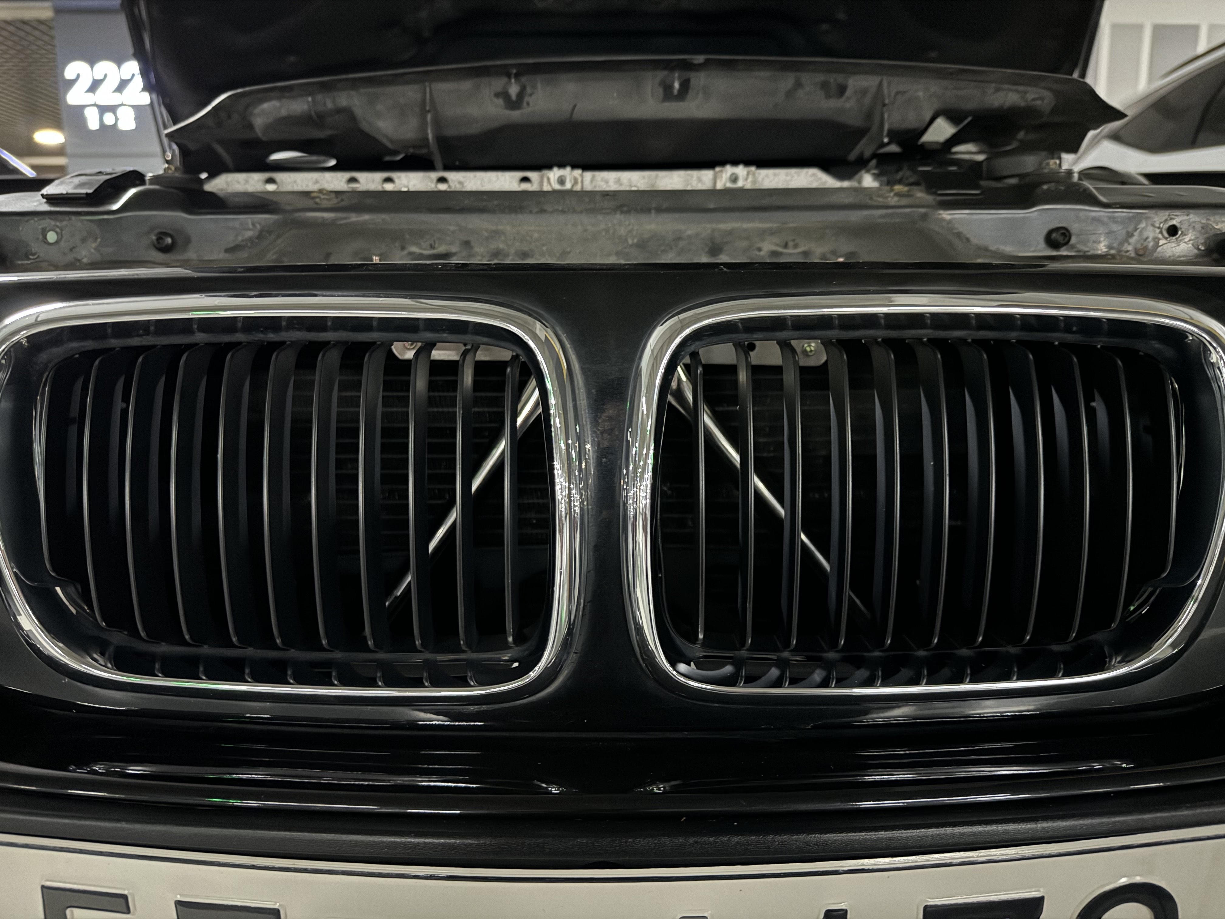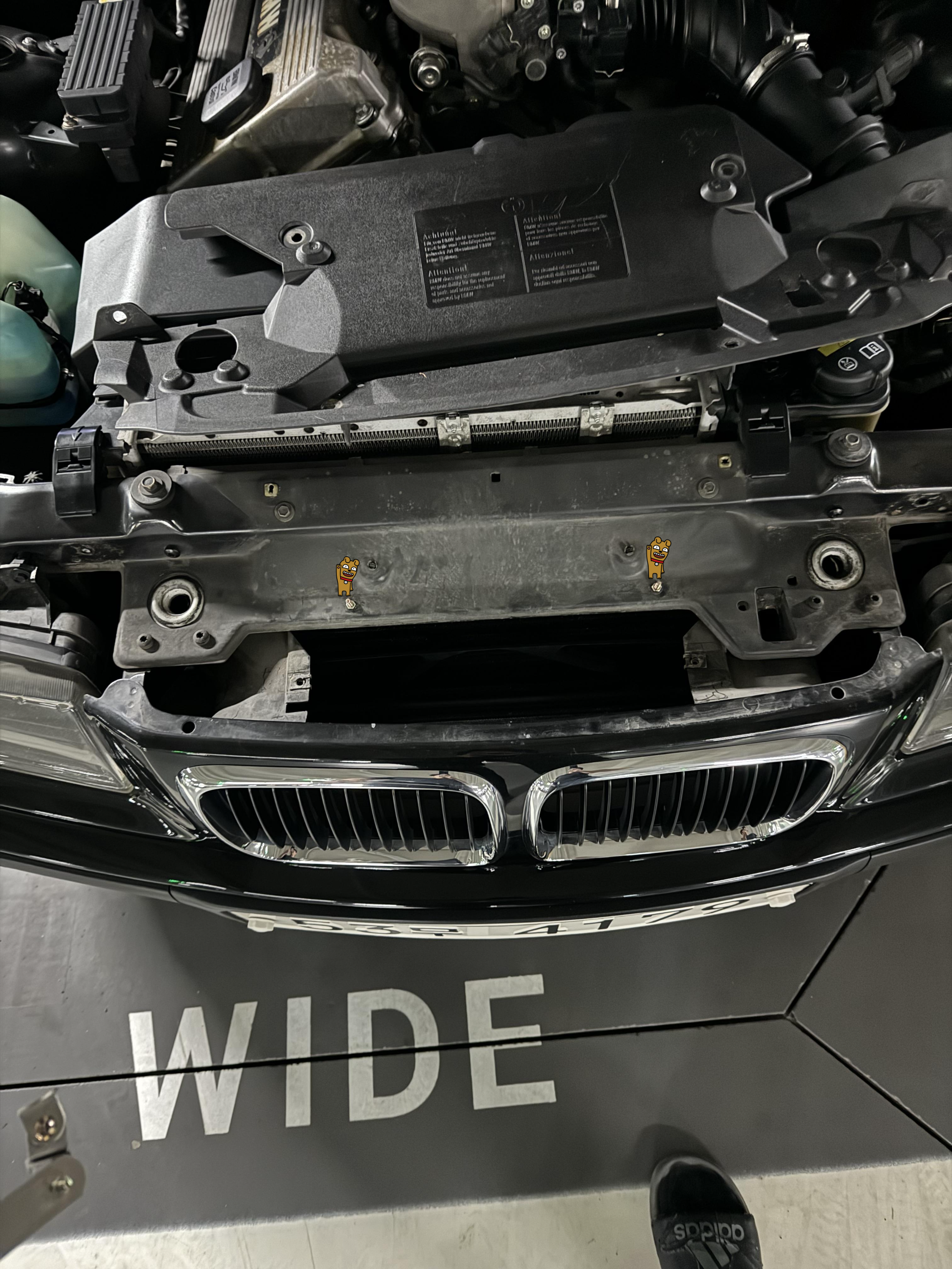자아.. 그럼 다시 차에 와서, 수술 준비를 한다. 덮개를 하나 뜯어내고 그릴 바로 뒷편에 스트럿바를 넣을 공간이 있다. 저 구멍에 스트럿바를 넣고 아까 ㄱ자 브라켓이 양 끝에 위치한대로 구멍에 맞추고 볼트와 너트로 체결한다.