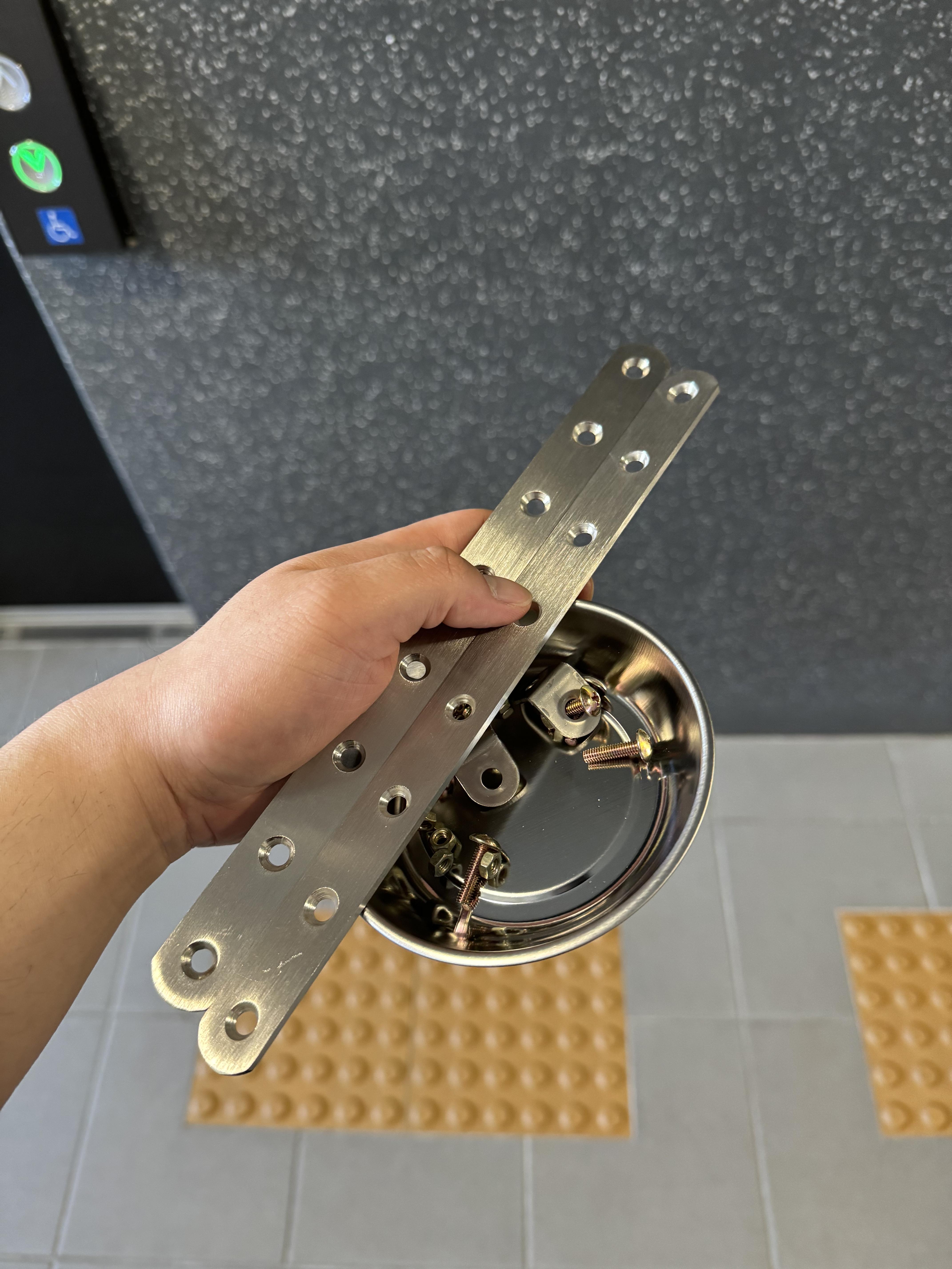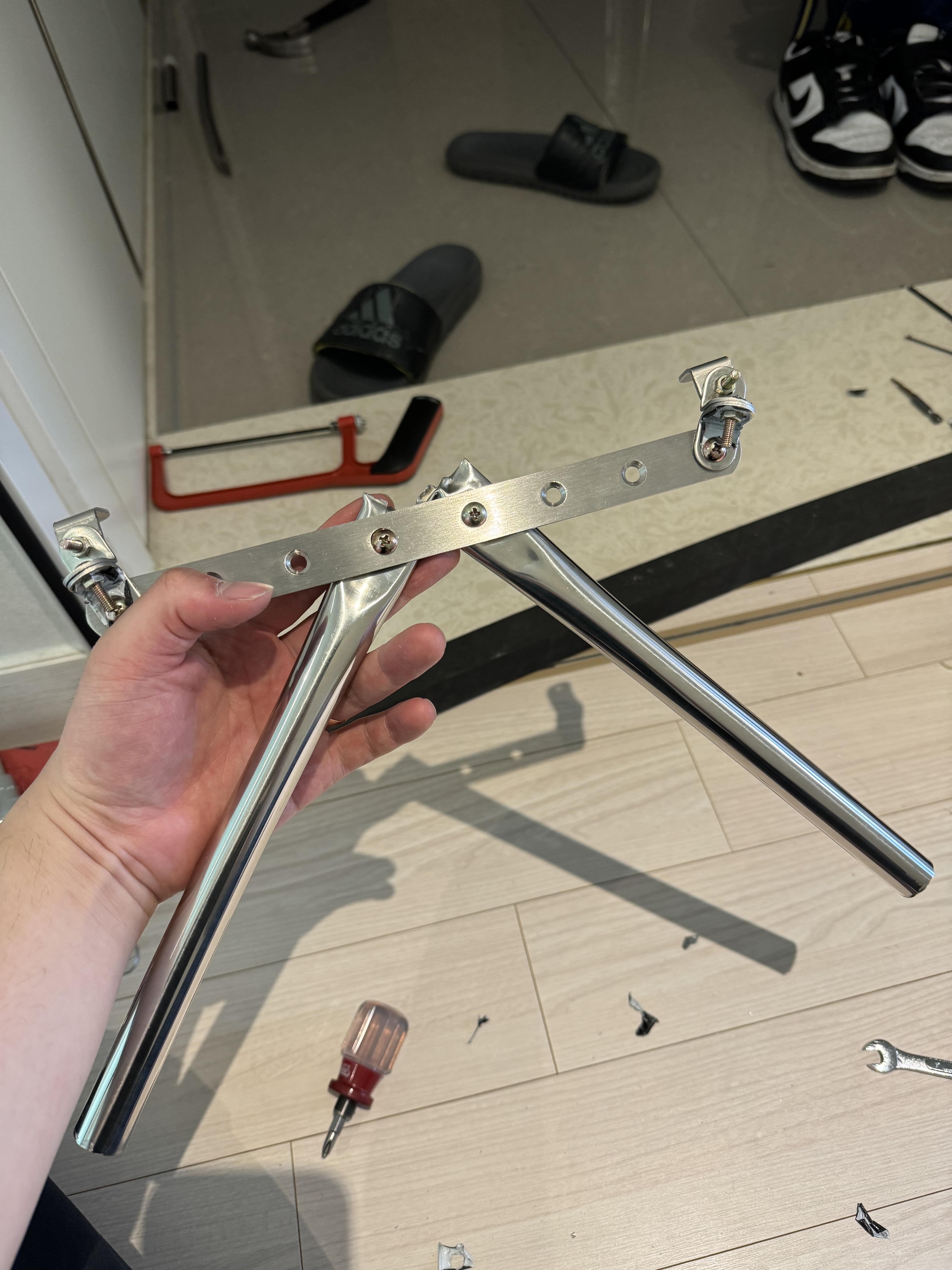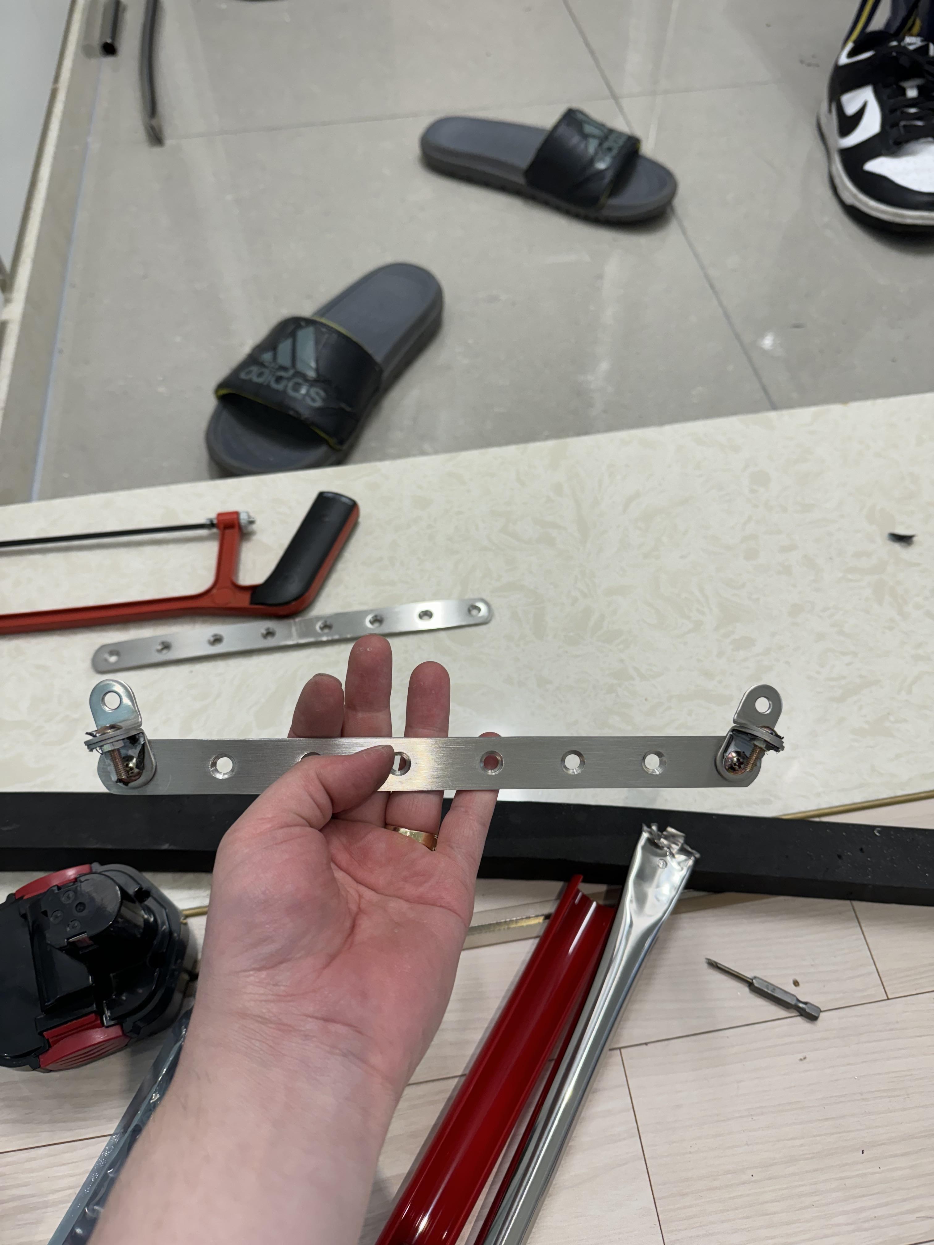 우선 ㅣ자 브라켓에서 가장 가까운 두 개의 구멍에 봉을 연결했는데, 한 칸씩 멀리 배치해줘야 할 것 같다. 그리고 궁극적으로 도색이 필요하다. 빨간색이 좋겠다.
