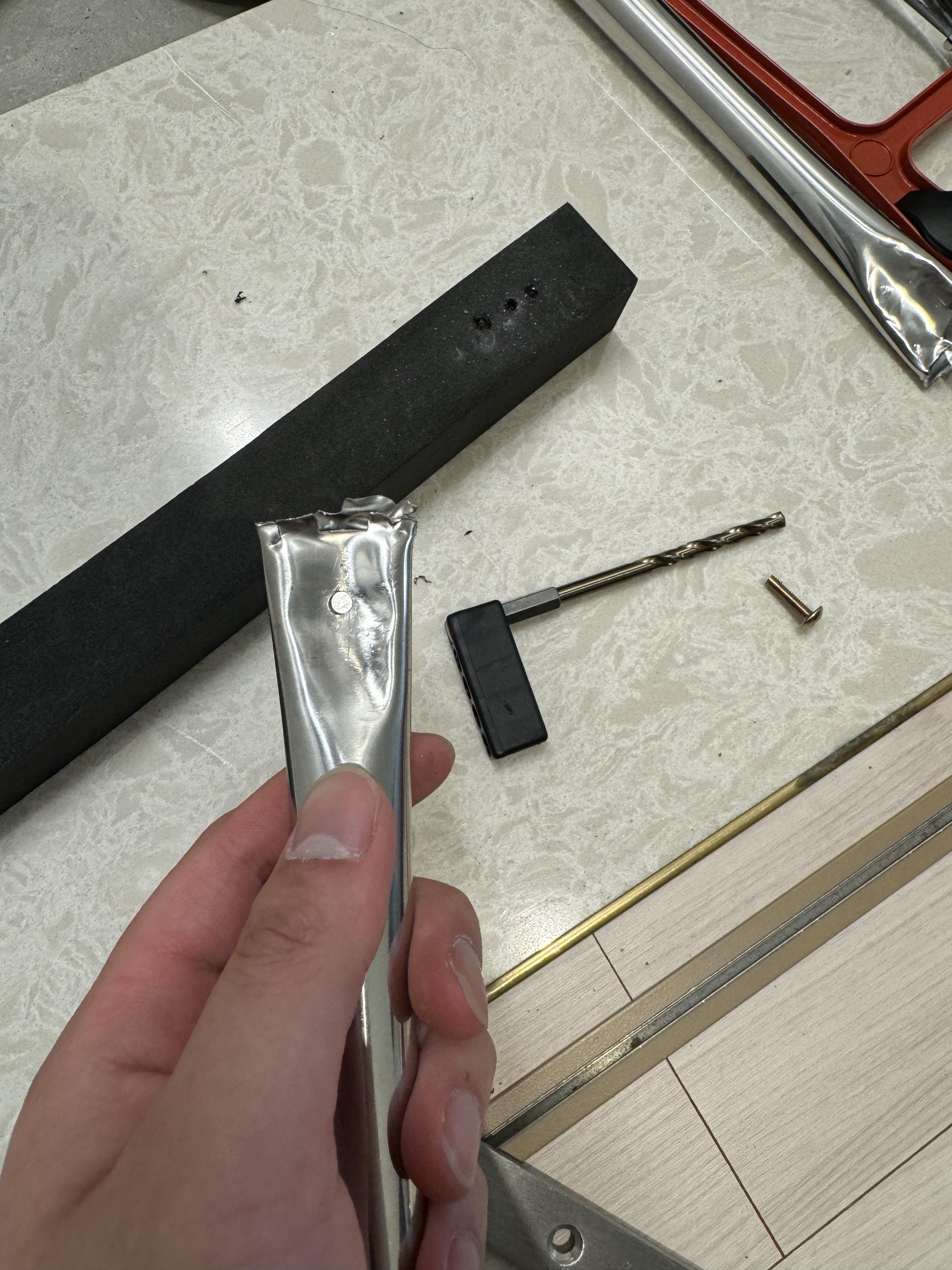이미 우리 선배님들도 나와 같은 경험을 했었구나. 코발트 기리를 쓰면 잘 뚫어낼 수 있다고 하는데 여기서도 노하우가 필요하다. 그냥 큰 걸 바로 들이대면 절대 구멍이 안 나고 흠만 생긴다. 그리고 너무 세게 누르면 코발트 기리도 그냥 부러져 버린다. 일단은 얇은 기리를 사용해서 최대한 깊게 파낸 후에 점차 큰 기리를 이용해서 뚫는 게 중요하다. 그리고 가정용 드릴은 배터리가 금방 닳기 때문에 수시로 충전하면서 총 2시간 만에 구멍을 4개 뚫었다. (왜 4개냐면, 봉 하나 당 앞 뒤로 구멍 2개 이므로..) 노하우가 없어서 코발트 기리도 두 개 부러뜨렸다. 정말 이대로 망하는가 싶었다.