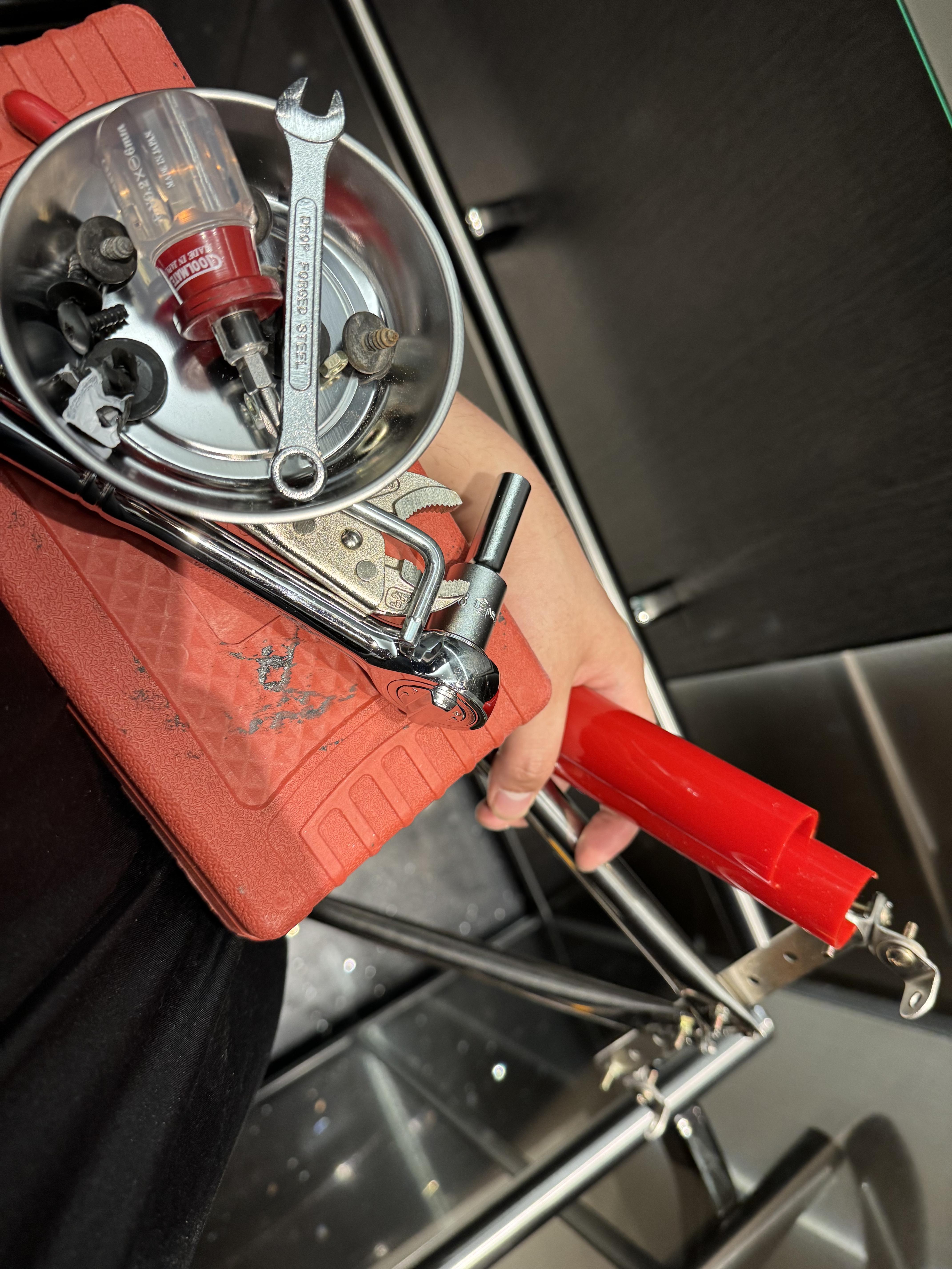 먼저 차량을 보면 앞의 커버를 하나 분리한 후, 카톡개 두 마리가 서 있는 곳에 두 개의 구멍이 있다. 용도는 잘 모르겠으나 사용하지 않는 구멍이 있어서 저기에 지지 가능한 브라켓을 연결하면 될 것 같았다. ㄱ자 브라킷을 위 사진 처럼 볼트와 너트를 이용해 고정하고, 그 두 개의 브라켓을 ㅣ자 브라켓으로 연결하면 가로로 지지가 가능해진다. 여기에서 빨래건조대 파이프를 잘라 볼트와 너트로 ㅣ자 브라켓에 ㅅ자로 배치하는 것이 나의 구상!