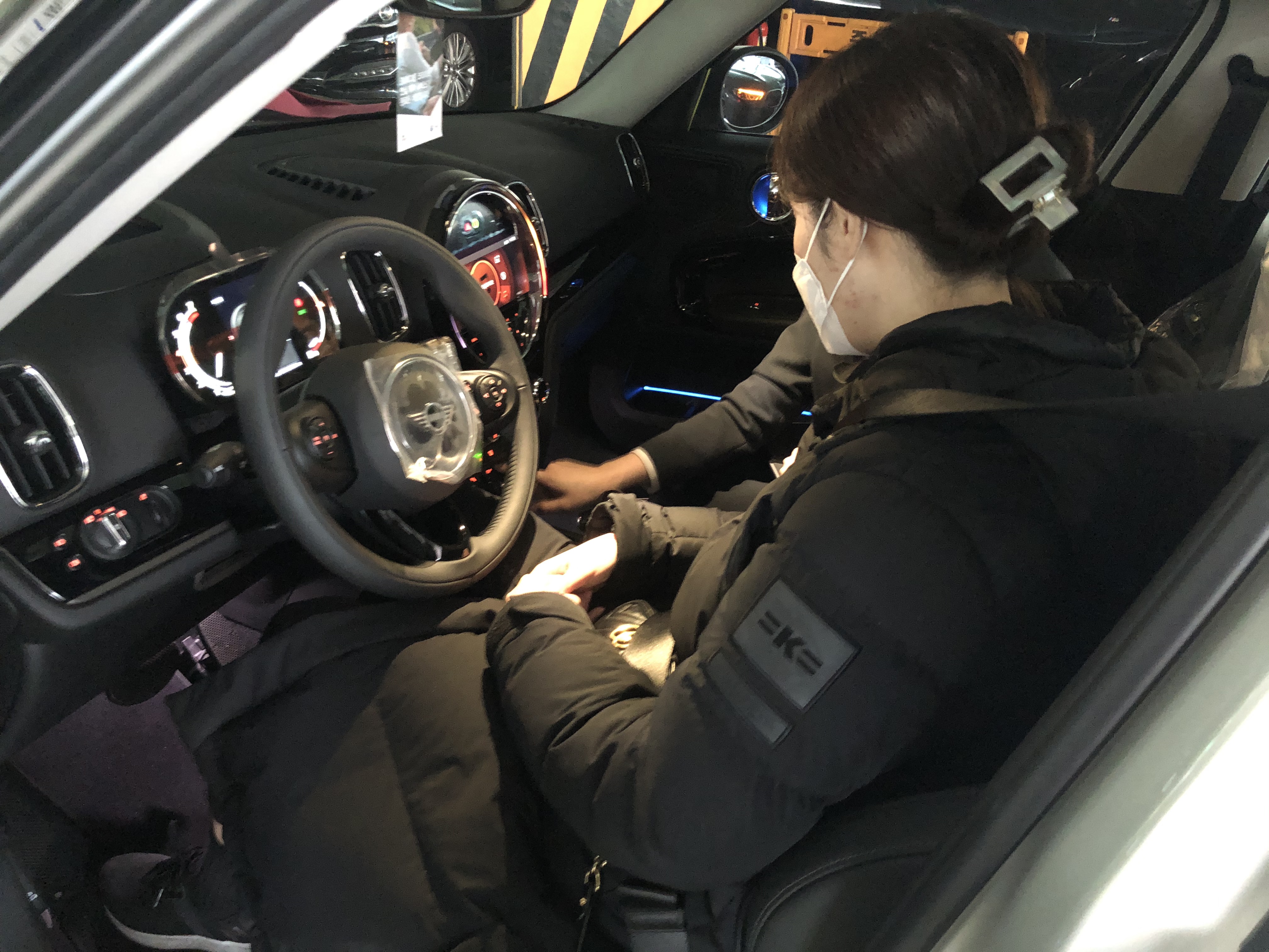 전시장에 도착하니 백색에 회색 물감 한 방울을 떨어뜨린 듯한 컬러의 컨트리맨이 우리를 기다리고 있었다. 아내는 차를 보자마자 잇몸이 만개하면서 차 옆에 서서 사진 찍어달라고 아우성이었고, 딜러 분이 차량 설명을 해도 귀에 들리지 않는 기분인 듯 했다. 뭐.. 설명 안 들어도 이미 유튜브 영상 수십개는 봤기 때문에 웬만한 기능은 다 알리라..