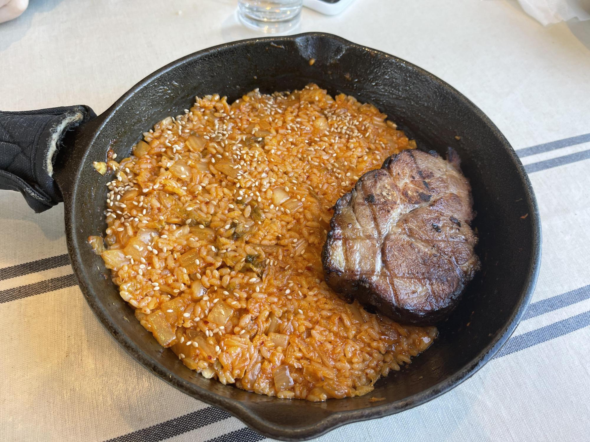 김치볶음밥을 한 스푼 뜬 다음에, 와사비를 살짝 얹은 스테이크를 밥 위에 올린 후 입을 왕 하고 벌려 넣으면 보들보들 씹히는 스테이크와 달콤짭쪼름한 김치볶음밥이 뒤엉켜 최고의 맛 조합을 이뤄낸다.
