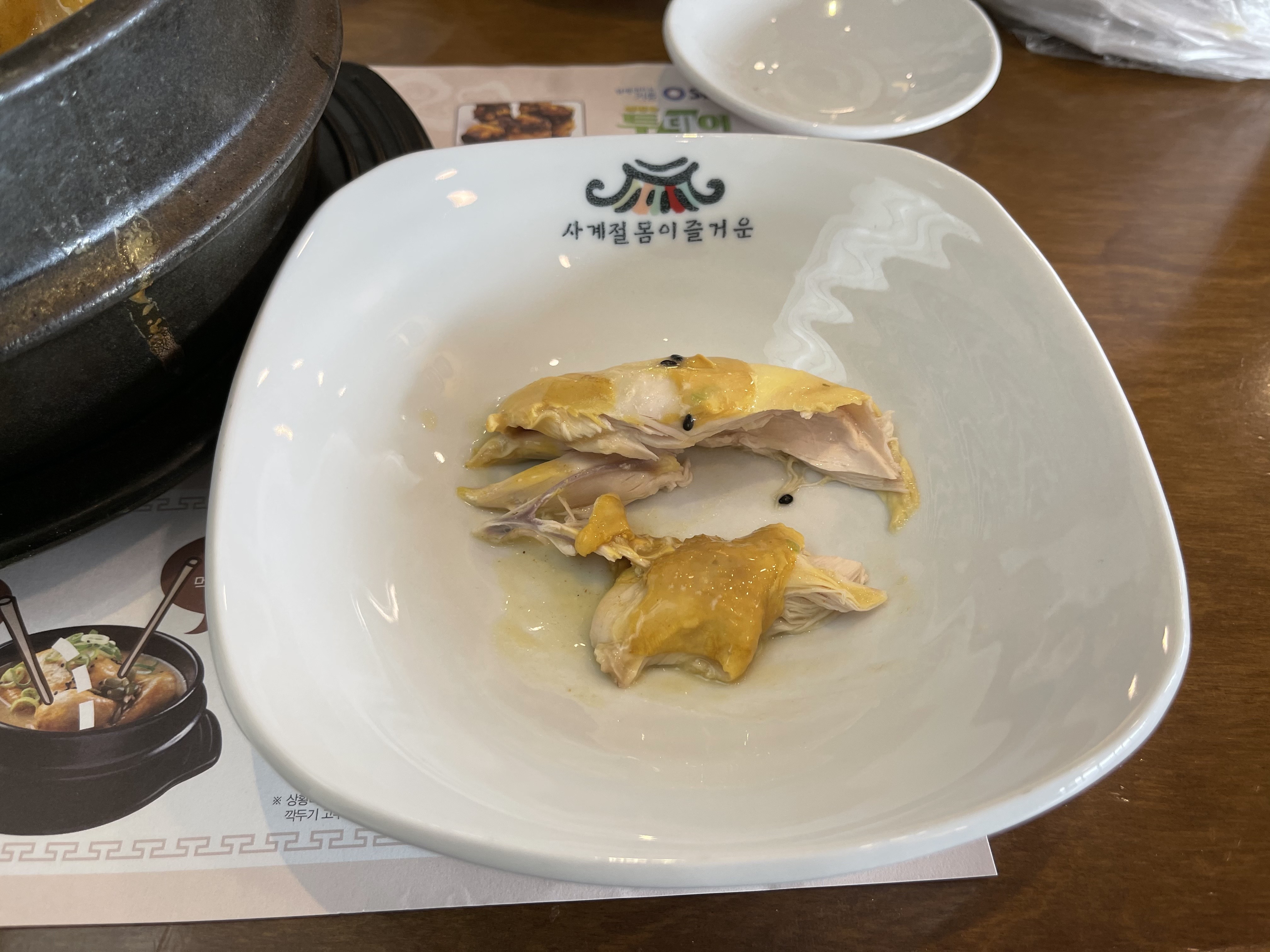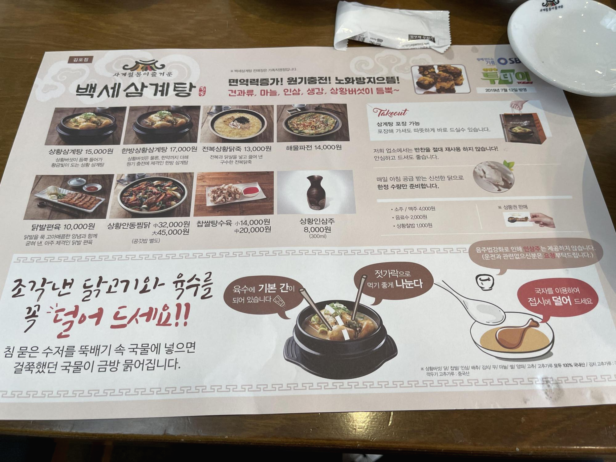 자리에 앉으니 식탁 위에 깔려 있는 종이가 메뉴판을 대체하는듯 했다. 삼계탕은 기본 상황삼계탕과 한방상황삼계탕이 있었는데, 나는 상황삼계탕을, 아내는 한방삼계탕을 주문했다. 지금 사진으로 보니 맛있게 먹는 법이 적혀있는 걸 알았다. 접시에 국물과 고기를 담아서 숟가락으로 먹었는데, 아주 올바르게 먹은 것 같다.