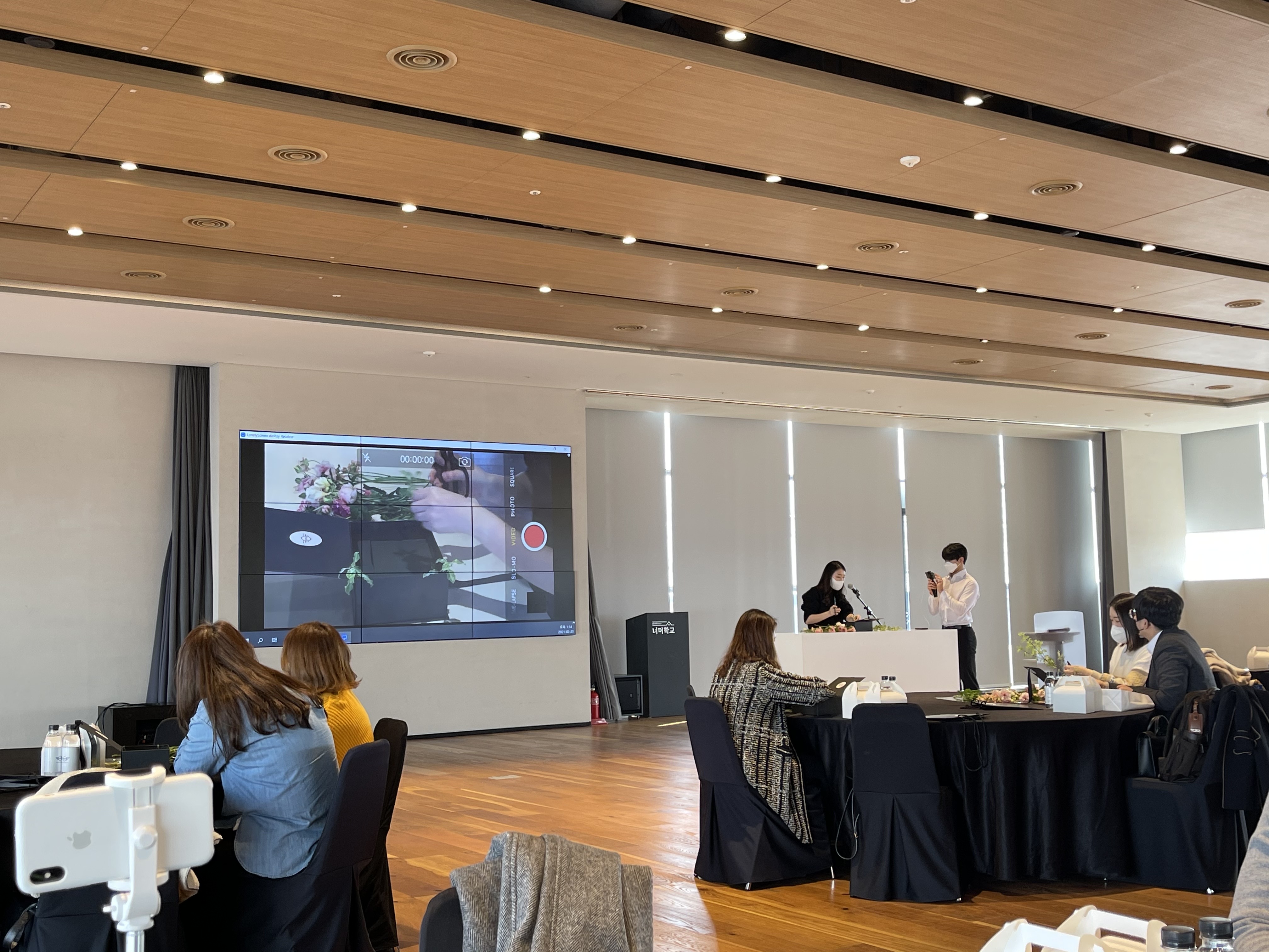 행사가 시작되고 한 8~10 가지의 꽃을 테이블에 나눠주고, 각자 미리 나눠준 박스에 꽃을 원하는대로 꽂는 식으로 클래스는 진행된다. 원래 맨 앞의 화면에서 플로리스트 분을 따라해도 된다고 하는데, 너무 빠르셔서 그냥 우리 꽂히는 대로 하기로 했다. 아래는 열심히 둘이서 꽃을 이곳 저곳 꽂는 영상이다.