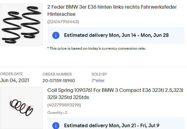 후륜, 전륜 코일스프링을 찾을 수 있었다. ㅠㅠ. 아마 파트넘버는 정확하지 않을 거다. 근데 그렇다 해도 그 파트넘버와 유사한 스프링 리스트가 쭉 검색이 됐고 하나 하나 누르면서 내 차량의 모델명과 대조해보며 호환이 된다는 걸 확신하고 구매했다. 일단 후륜 스프링의 호환 영역은 https://www.ebay.com/itm/224147916443 에서 확인할 수 있고, 전륜은 https://www.ebay.com/itm/402795893298 여기에서 확인할 수 있다. (상품이 없어지면 링크도 없어질 것 같지만..)