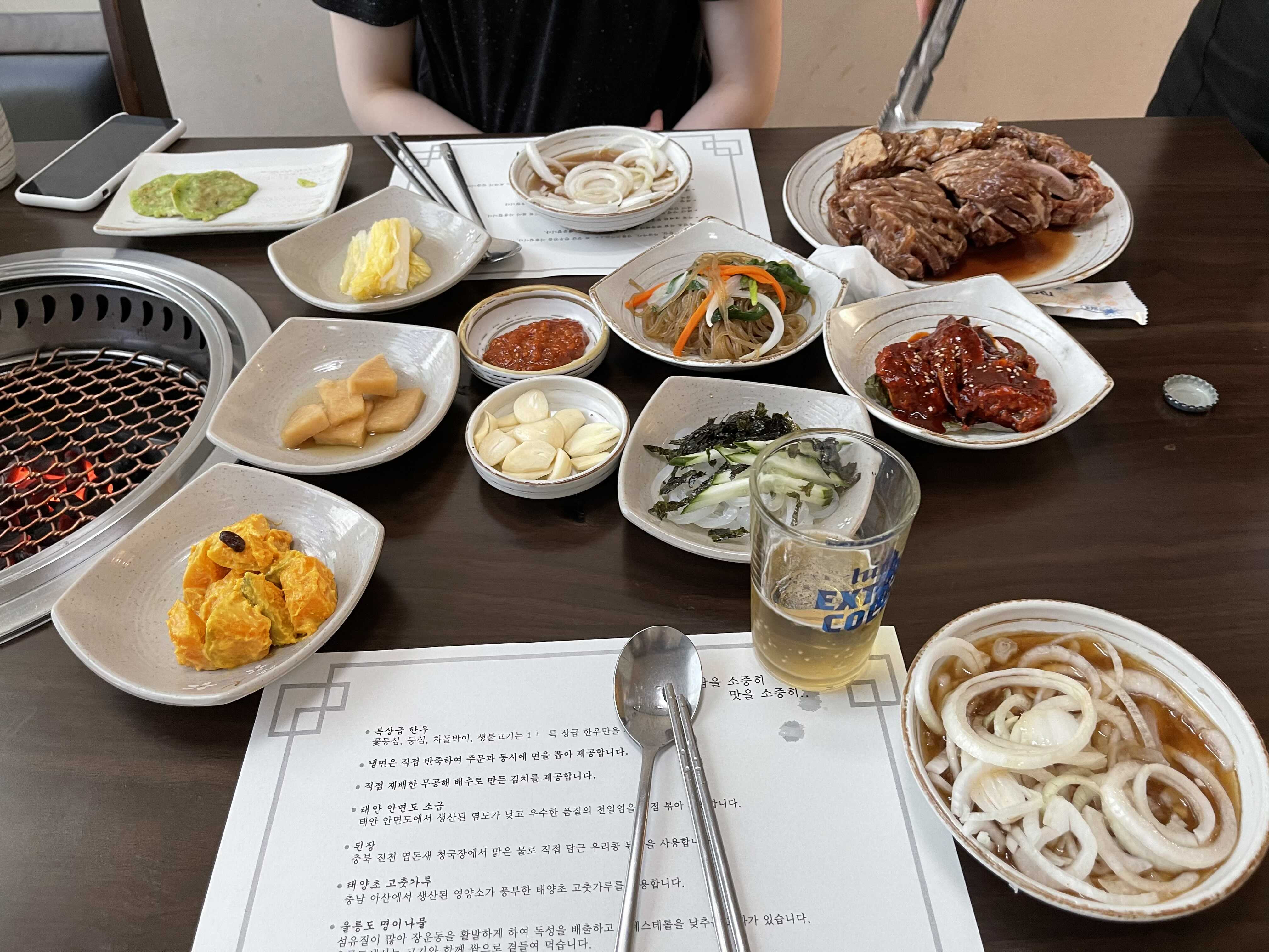 항상 고기를 먹고 나면 된장찌개를 시킨다. 여기에서는 차돌 된장이 메뉴에 있었는데, 살짝 짭조름 한 게 소맥 한 잔이랑 먹기에 아주 안성맞춤이었다. 갈비는 2인분에 끝내기 너무 아쉬워 1인분을 더 시켰다. 간장이 고기에 잘 배어들어 달콤 짭쪼름한 맛이 하루 종일 흘린 땀에 대한 커다란 보상으로 다가왔다.