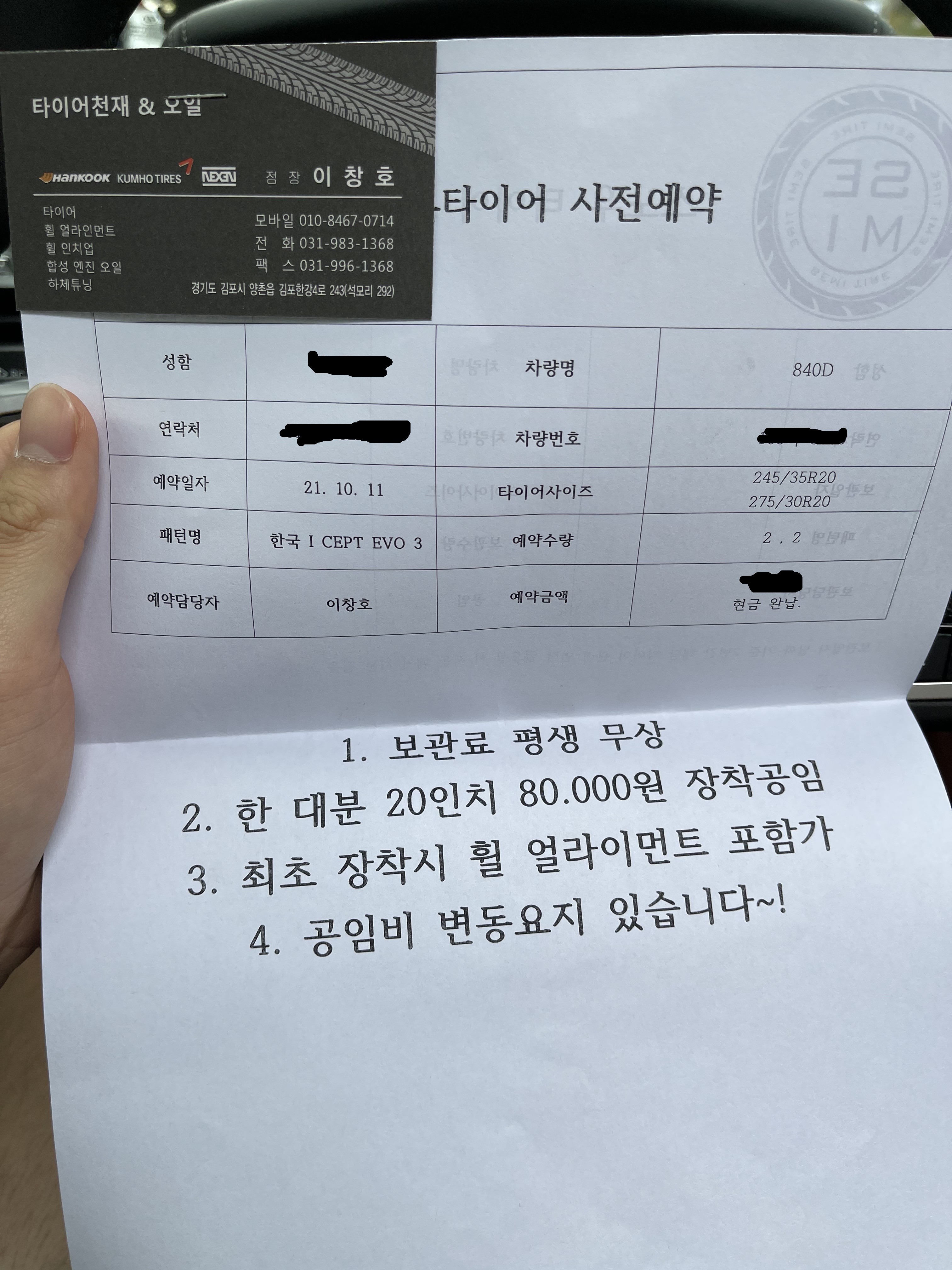 나쁘지 않을 것으로 판단. 타이어 천재에서 계약을 하기로 하고 사전 예약을 완료했다. 보관료는 무상이지만 봄에 타이어 변경을 할 때 탈착비가 발생한다. 박리다매로 하는 업체기 때문에 언제든 탈착 공임은 변동될 수 있다고 한다. 그래도 미리 상세하고 솔직하게 설명해주시는 사장님 말씀이 믿음이 가고, 다른 차량 윈터 타이어도 여기서 해야겠다 싶어 컨트리맨 차량의 타이어도 함께 사전 예약을 하고 왔다.